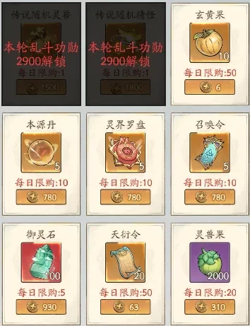 ①商店功勋兑换性价比最高的是玄黄果,每日可兑换50次,耗费300功勋,其次是先天灵草,然后是本源丹、法宝罗盘、召唤令,最后才是御灵石,最终是缺啥兑换啥即可