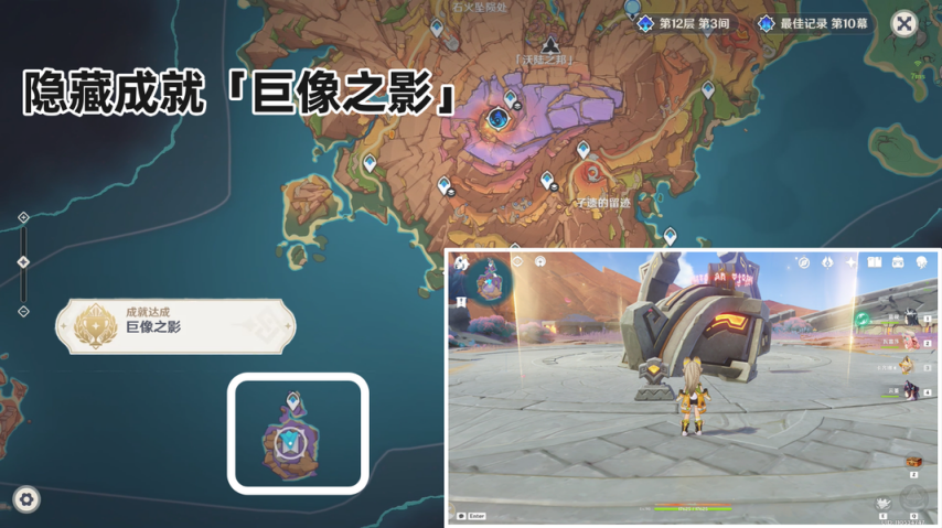 来到「沃陆之邦」西南小岛如下图位置,完成「秘源龙像」解密,即可获得隐藏成就「巨像之影」。