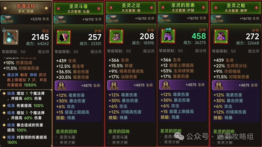 圣灵四件套,头盔+鞋+护腿+胸甲,加基础技能伤害(普攻);圣化武器龙魂法杖可以触发弹跳7次,圣化词条五暗涌,不一定非要5个,2个强度也很可观;手套蓄势待发,能量上限有伤害加成;副手祝祷,加暴击伤害;项链紫晖,加秒伤;护肩灵风,加攻速;戒指噬魔,加毒素伤害;神铸选择残暴,暴击伤害高于400,每高6%就会有大量的伤害加成;装备词条这里一定要优先洗暴击伤害/暴击率/元素伤害/能量上限。