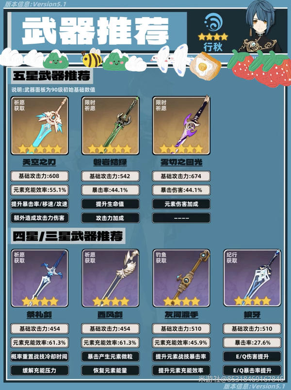 4. 天空之刃:拥有高攻击白值以及暴击率加成,可缓解少量圣遗物暴击率词条压力,对于行秋的输出提升也有一定帮助。