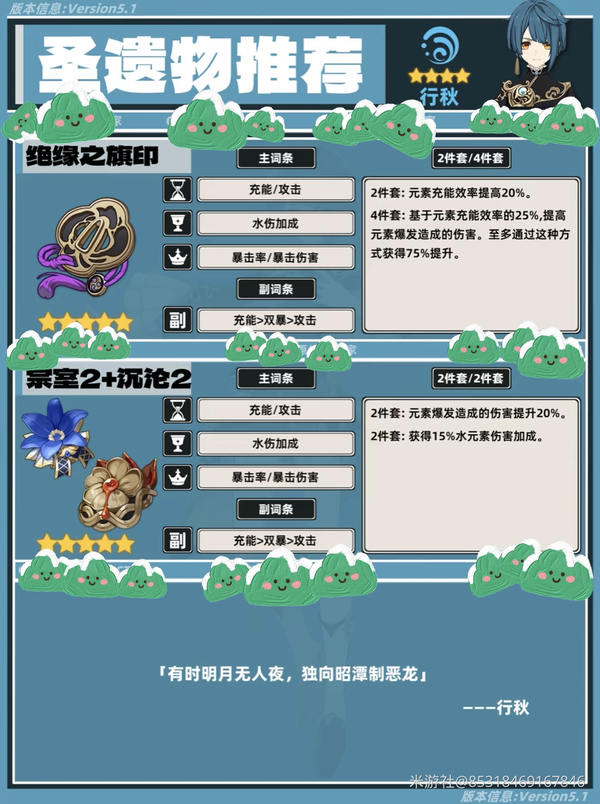2. 沉沦之心2件套+昔日宗室之仪2件套:沉沦两件套提供15%的水元素伤害加成,宗室两件套提供20%元素爆发伤害加成,能全面提升行秋的输出能力,是目前对副C行秋伤害提升较高的圣遗物搭配方案 。当队伍中无人带宗室套时,行秋可穿宗室套,但要注意让行秋第一个释放技能,以便队友能够吃到宗室套效果。