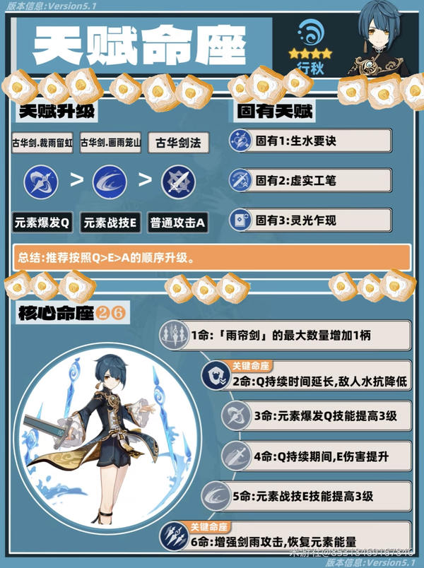 6. 六命:极大地增强行秋的元素爆发输出效率,提高其作为副DPS的能力,特别是搭配火元素输出角色时效果更佳。击中敌人时,还能为其提供元素能量回复,有效缓解行秋自身的能量压力,非常推荐抽取。