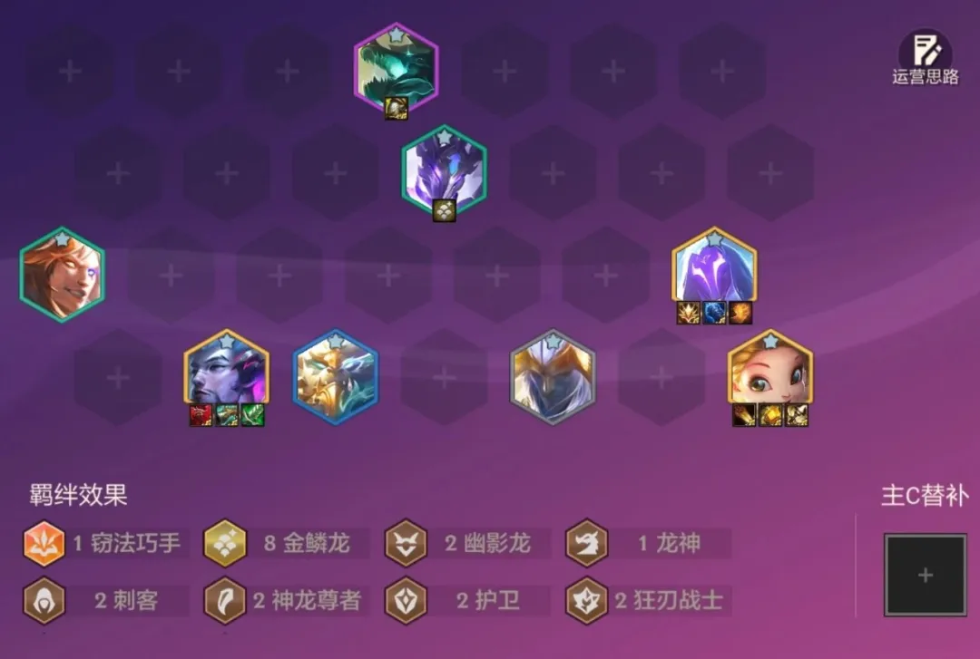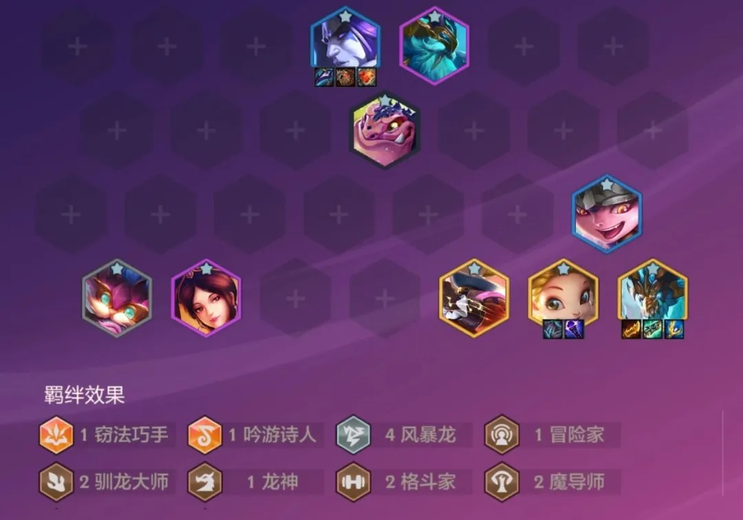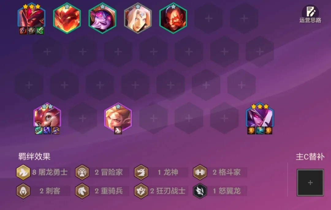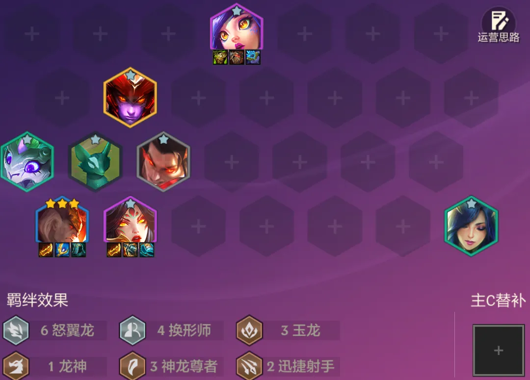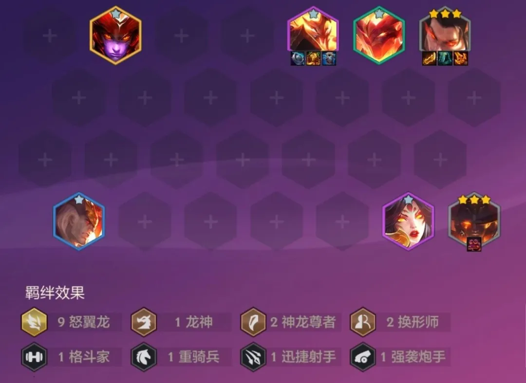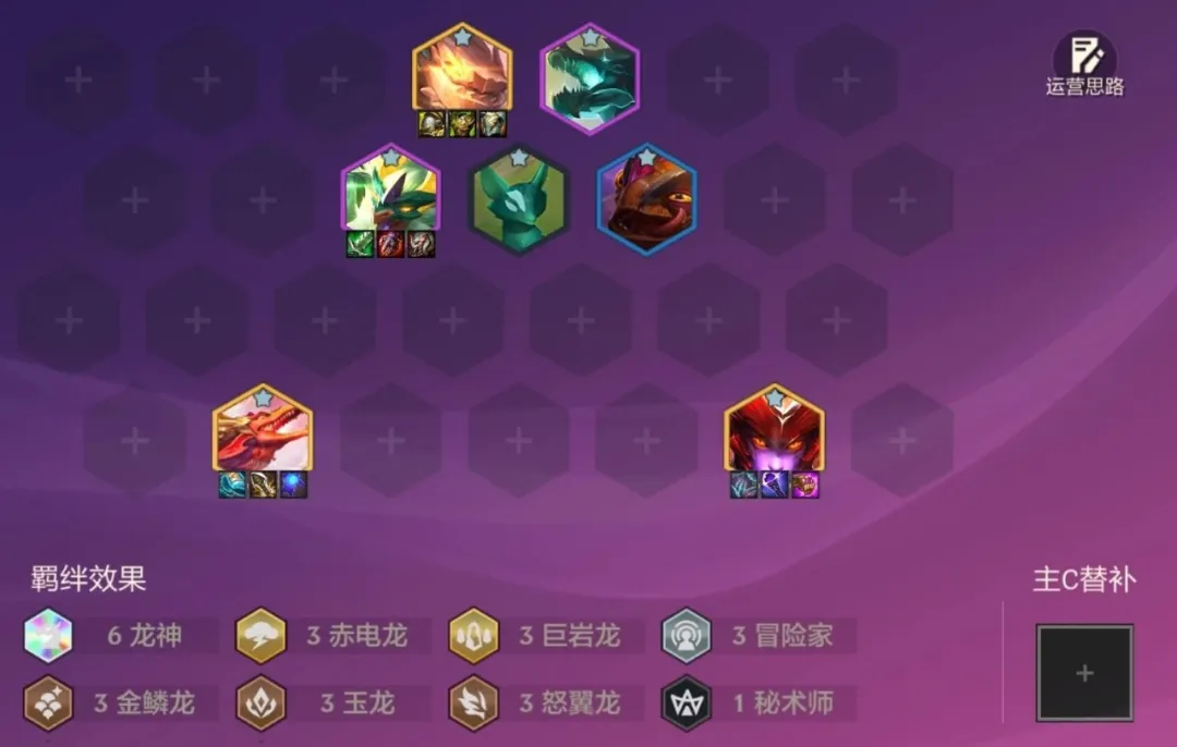 正常需要10人口才能开出6龙,因此需要龙神之路(选连胜/连败)到100层然后刷自然之力,这样9级成型。后排大C熬兴(羊刀/青龙刀、大天使、科技枪)/索尔(大天使、科技枪、法爆/帽子)/德拉克利斯(蓝buff、无尽、破防/杀人剑)三选一,新龙神德拉克利斯需要叠被动发育,来的越早越强