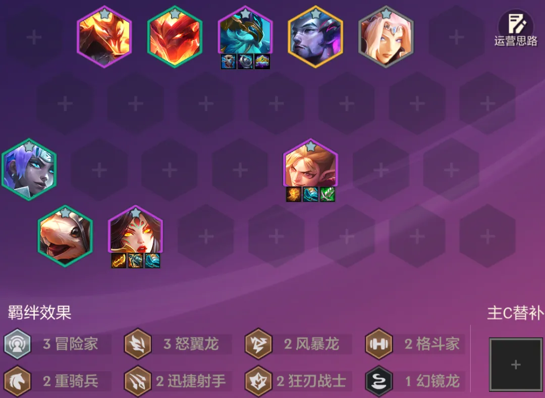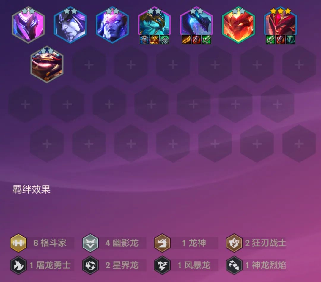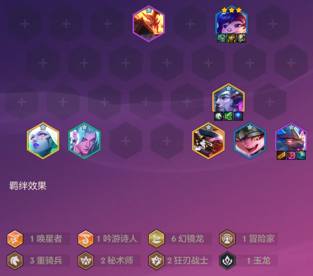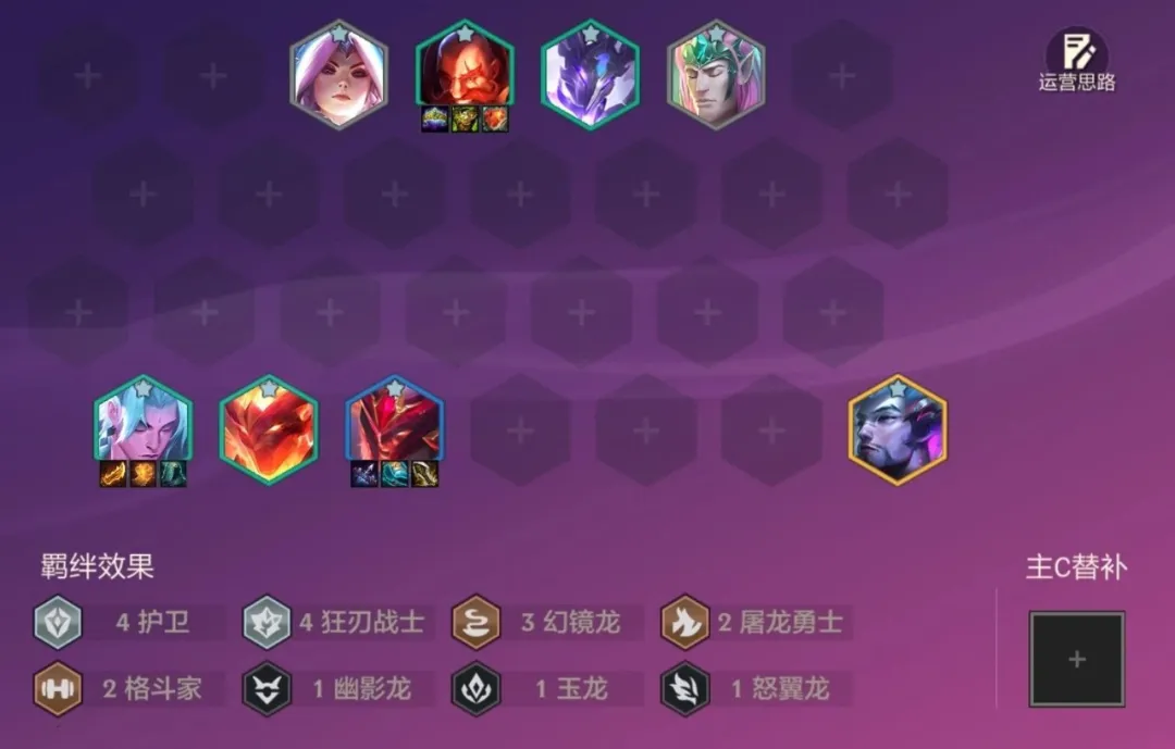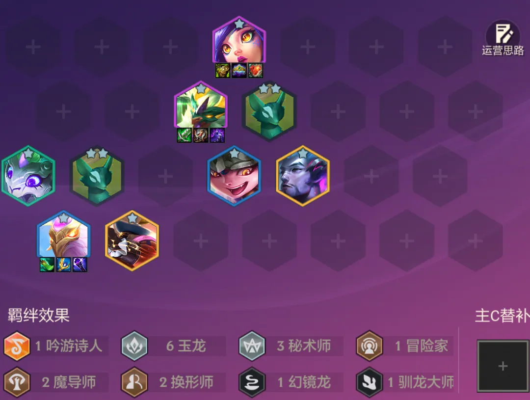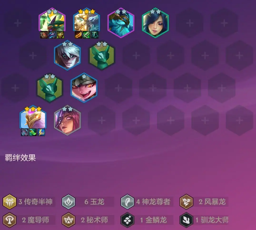 正常需要10人口才能开出6龙,因此需要龙神之路(选连胜/连败)到100层然后刷自然之力,这样9级成型。后排大C熬兴(羊刀/青龙刀、大天使、科技枪)/索尔(大天使、科技枪、法爆/帽子)/德拉克利斯(蓝buff、无尽、破防/杀人剑)三选一,新龙神德拉克利斯需要叠被动发育,来的越早越强