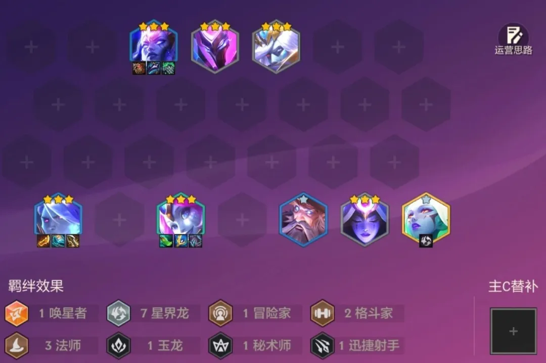 偏娱乐玩法,最好开局有星界转职(铲+大棒)再玩,然后选专注之路!想硬玩实测选隐忍之路,10连败转连胜才能100层,花钱D铲子合星界转。运营开局先3星界连败,选秀捡铲或者叠到100层花一块钱刷铲,5级追2张1费星界棋子三星(直接上6容易卡格子),3-5左右升6D全部三星(外援先用瑞兹,经济很好可以3-7升7D),4-5选秀拿任意5费,升7给上转职,每波D到该张5费停手(野怪回合也可以),重复操作就能7级三星5费(7级没位置时三星豹女在场下挂机,5费卡有10张,被卡1张也能三)。新版星级转有点像约德尔人,分奴模式追4费卡更稳,5费容易被卡