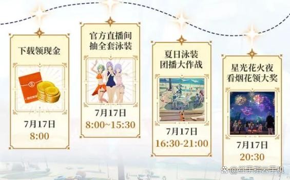 时间限定活动:8:00 下载游戏可领现金红包;8:00-15:30 官方直播间抽全套泳装;16:30-21:00 参与 “夏日泳装拼图大作战”;20:30″星光花火夜” 活动中,观看烟花即可领取随机大奖。