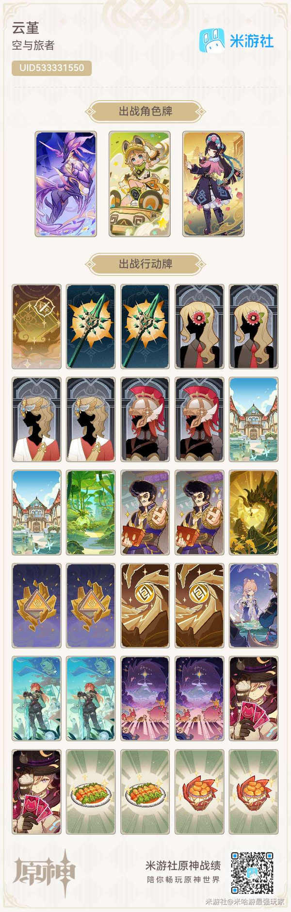 就实战来看,云堇带两个酒庄有着非常不错的效果。配合纵声欢唱能打出一轮0骰6切,面对以双水为首的前期伤害不高,但是能冻住你的卡组,就可以一直逛街,随后切云堇一轮sha完