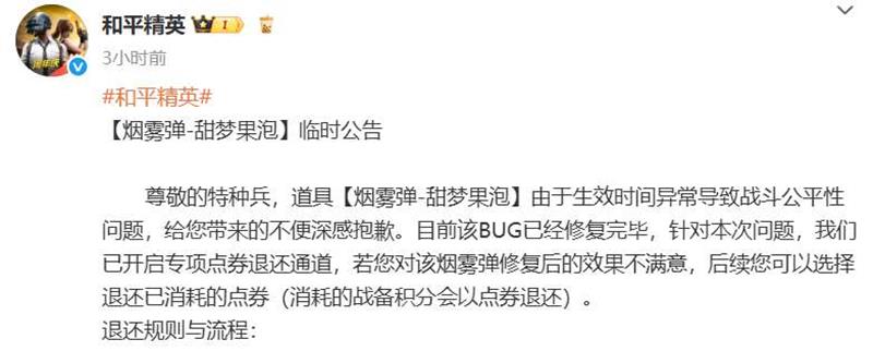 和平精英近期对甜梦果泡烟雾弹的BUG进行了修复,并且就修文bug问题发布了专门公告,玩家们若不满意修复后效果也可选择退款,同时也将退款步骤放出,我们来一起看看。