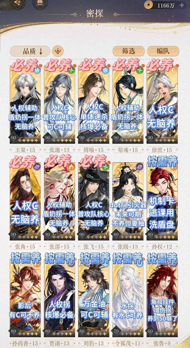 先说结论:1. 必养人权C:优先90级。养成原则:群攻>单体;不用赌>要赌;金卡>紫卡新手有啥用啥,实在抽不到卡用仓管过渡也行,但蓝卡不要养,紫卡别乱养。2. 必养人权辅助:次优先80-90级紫卡觉醒优先级:颜良>陈登>史子眇(陈登最高80够了)