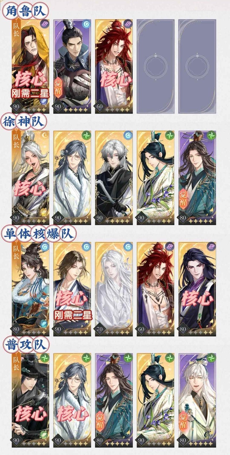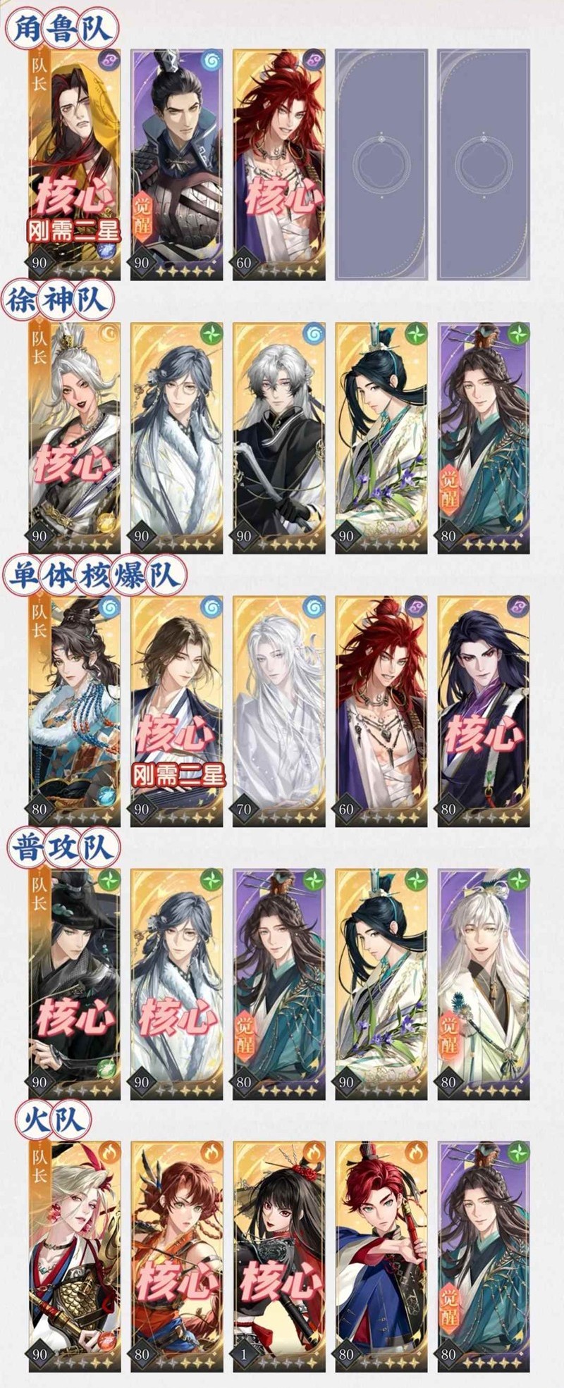 4. 命盘和星石都非常重要,甚至有时候比等级修为还重要。所有密探至少洗出核心两金,不然伤害少一大半。星石只观当季星图,建议至少拉一队能用的星石出来,2-3套输出星石,2-3套生命星石,全橙且40级以上,辅星全橙至少解神2颗,文曲2颗,主副C属性增伤星石30级以上。输出星石:天府、武曲、破军、天机、太阳生命星石:天相、天同、巨门、紫微、七杀资源不够多刷6-24。