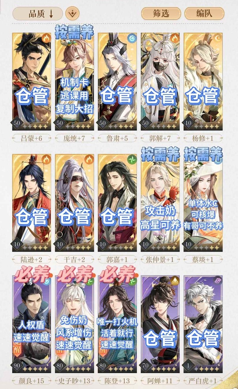 3. 按需养的卡:确定有队友/卡关再养,练度活着就行(常用的养到70,其他的站不住再升)贾诩、庞统都只能配技伤输出;孙权一般用来配角叔叠免伤逃课,或用他的嘲讽和多段攻击走机制;令狐茂、刘豹是水拐,养了水C再养水拐;