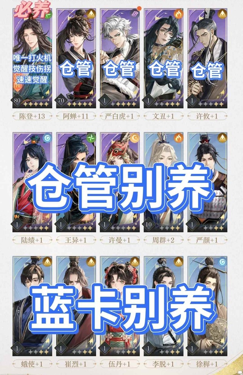 5. 除标注“必养”的几张卡之外,其他卡都不建议拉太高。因为如鸢版本更新太快了,池子也出得太快了,这边还没养起来,那边又出新人权的情况常有,资源非常缺。