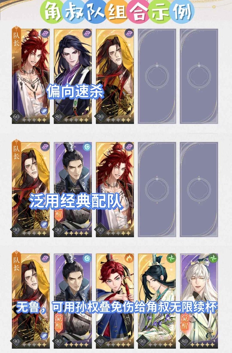 张鲁配角只需要养到开完命盘,无角的话需要一定练度不然很容易被吸死退场;4. 抽卡方面,如果是微氪/月卡党,不管密探多强,抽到一个就可以收手,慢慢捡垃圾到二星。因为卡池无定轨,太容易歪了,且后面的池也基本都是人权,所以必须要节省抽卡资源。