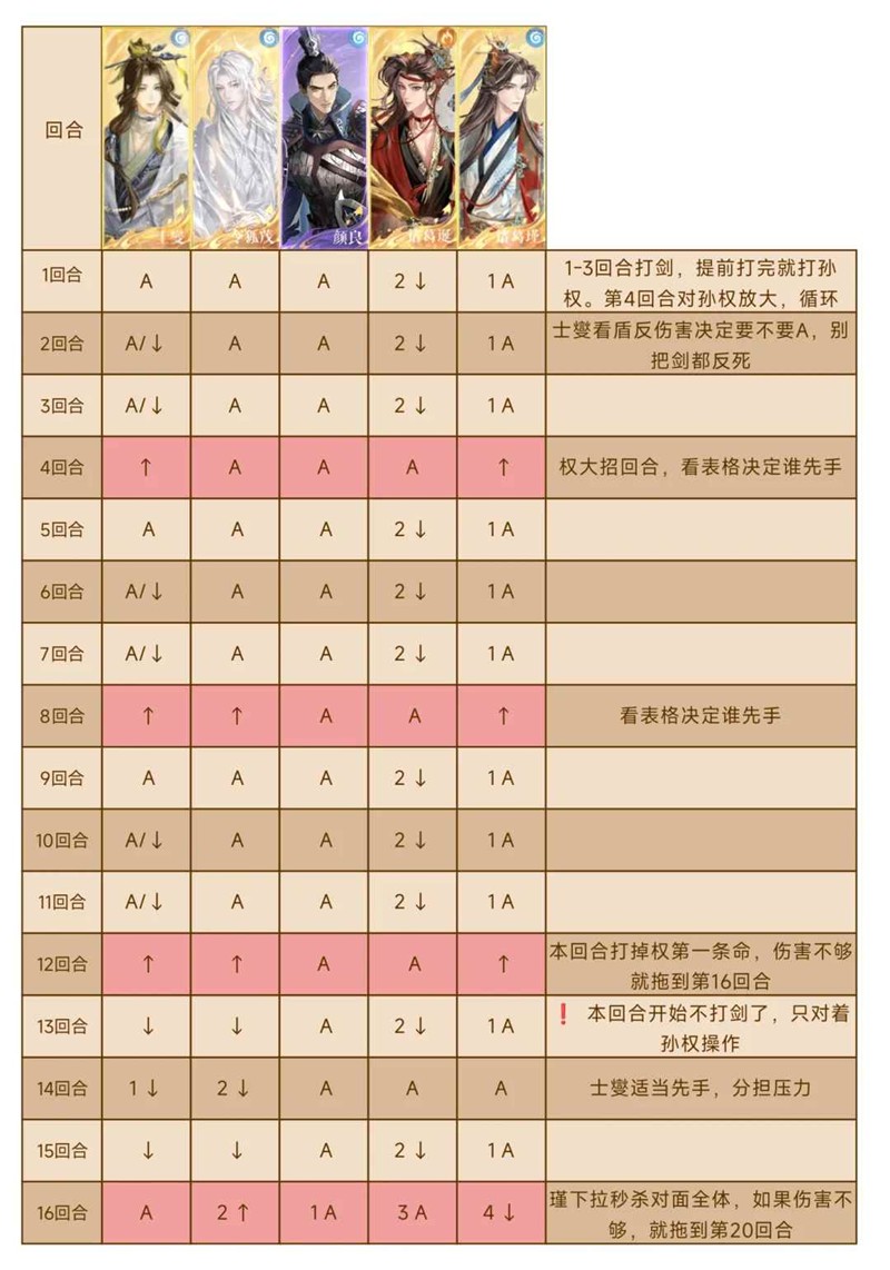 看到评论区反馈决定加上这条:权普攻回合不一定要一直诸葛瑾先手(谁先手权打谁),可以试试士燮/颜良先手,交替进行,分担一下压力扛不住的可以尝试:给士燮加攻击星石,给颜良加生命星石,给诸葛瑾加普抗星石如果孙权大招回合被秒杀,100%是因为搞错了先手密探或者剑的数量有误(第16回合情况除外)