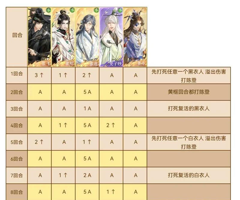 也可以尝试张昭当队长,但是控血很麻烦我就没搞。只要在固定回合打死白/黑衣人就行,剩下的伤害都打陈登,不要多打死小兵!!