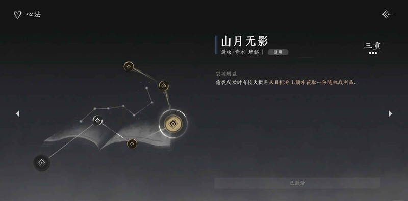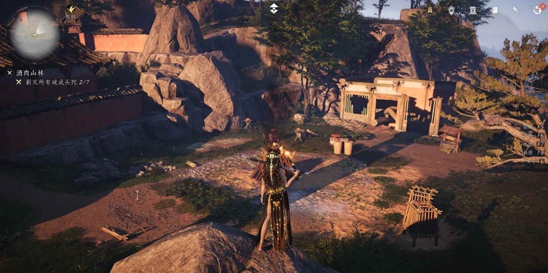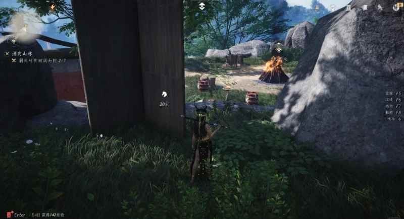 1. 带上心法“山月无影”,升级到三重2. 前往据点“酒肉山林” ,背后暗杀这两只怪(为了触发心法多得一份战利品)3. 清理完毕后,站在图片位置,头对准中间篝火