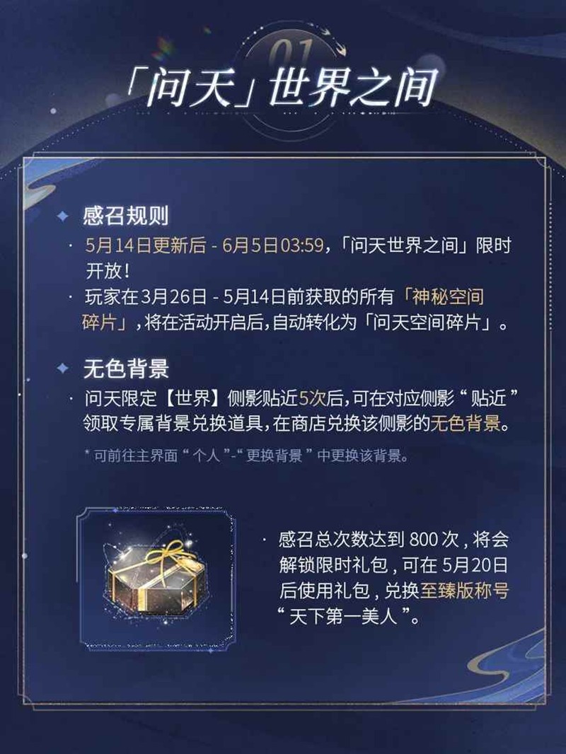 「问天世界之间」同步开放✦5月14日更新后-6月5日03:59「问天世界之间」限时开放,以下四款限定侧影:顾时夜 · 夜长如岁、易遇 · 一笑春温、柏源 · 诗酒年华、夏萧因 · 凤箫声动,全新上线!玩家可使用「问天空间碎片」进行感召。✦玩家在3月26日起至5月14日前获取的所有「神秘空间碎片」,将在活动开启后自动转化为「问天空间碎片」。✦在「问天世界之间」感召总次数达到800次,将解锁限时礼包,兑换后可获得至臻版称号“天下第一美人”。