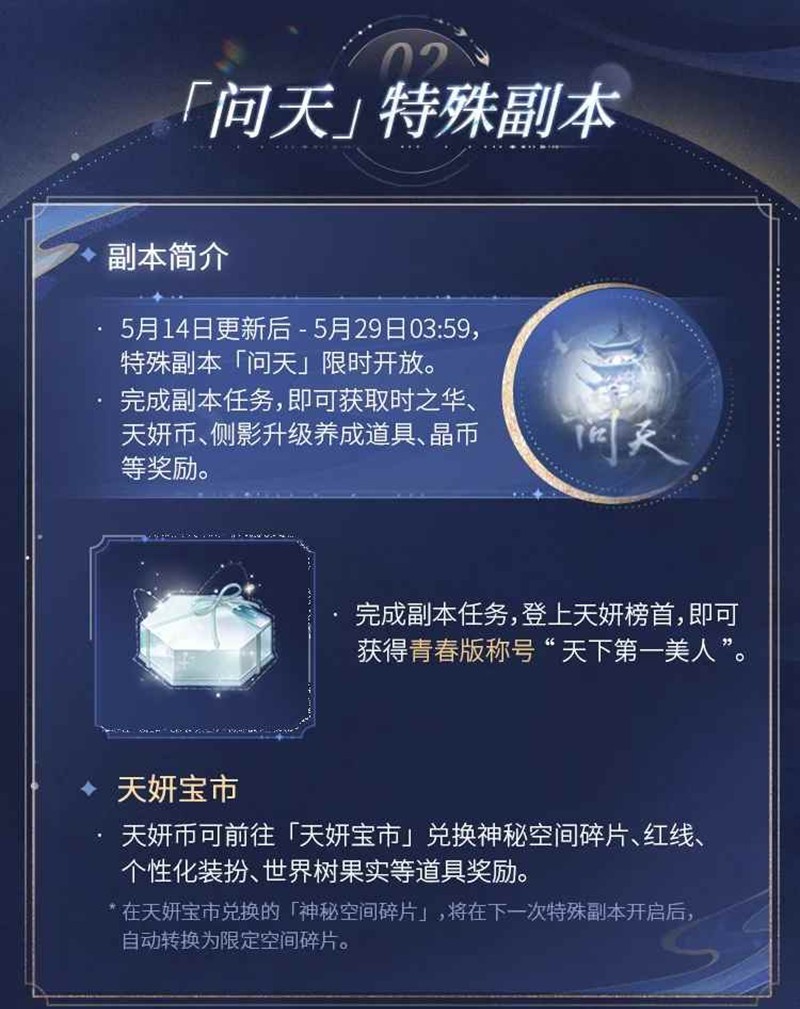 特殊副本「问天」限时开启✦5月14日更新后-5月29日 03:59,完成限时副本任务,即可获取时之华、天妍币、侧影升级养成道具、晶币等奖励。✦天妍币可前往「天妍宝市」兑换神秘空间碎片、红线、个性化装扮、世界树果实等奖励。*在天妍宝市兑换的神秘空间碎片,将在下一次特殊副本开启后,自动转换为限定空间碎片。✦完成副本任务,登上天妍榜首,即可获得青春版称号“天下第一美人”。