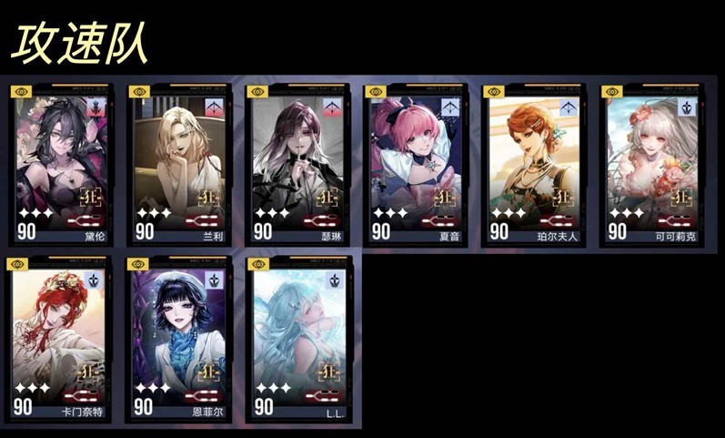 攻速队核心角色其实只有可可莉克和珀尔夫人。我个人是很喜欢用攻速队的,全队都带上绯花之后就可以尽情输出,我一般用L.L代替夏音上场。