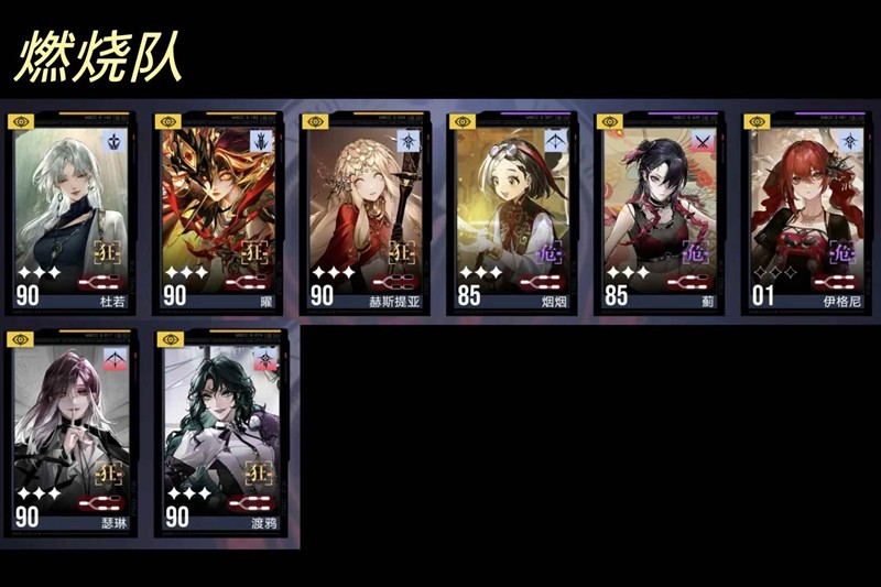 燃烧队(法术)目前法队体系中的TOP。伊格尼通常情况用不着,前五位是核心,其中主C可以是曜(boss关)也可以是赫斯提亚(小怪较多关),可以两者选一人上场。我通常是两人一起上,赫斯提亚负责清杂和补伤,曜负责破核后开大输出。在一些核心较多的关卡,燃烧队也是比较缺破核手,瑟琳输出、破核兼顾,渡鸦也有增伤、破核的效果,二者都是被曜吃的好对象,可上场。