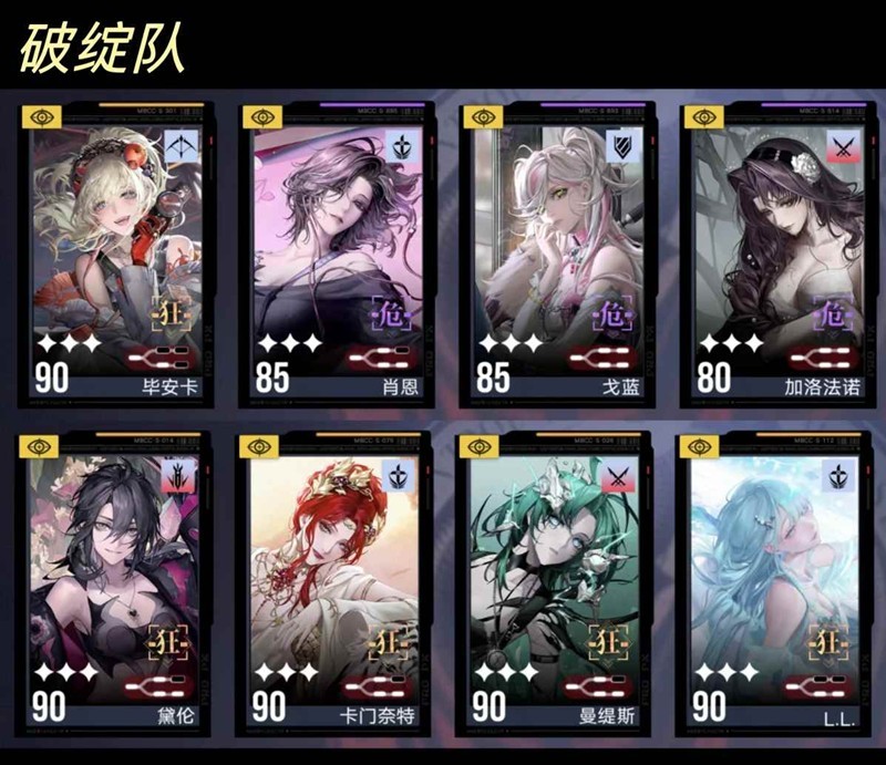 总结了一下当前版本的的几大体系:上一排是体系中的核心的成员,下一排是与该体系较适配的角色。破绽队(物理)破绽队可以说是目前的版本之子。加洛法诺可以不上场,主要核心为前三位。L.L可以让毕安卡持续开大,破绽队算是比较缺破核的,导演、曼缇斯都是破核大户。