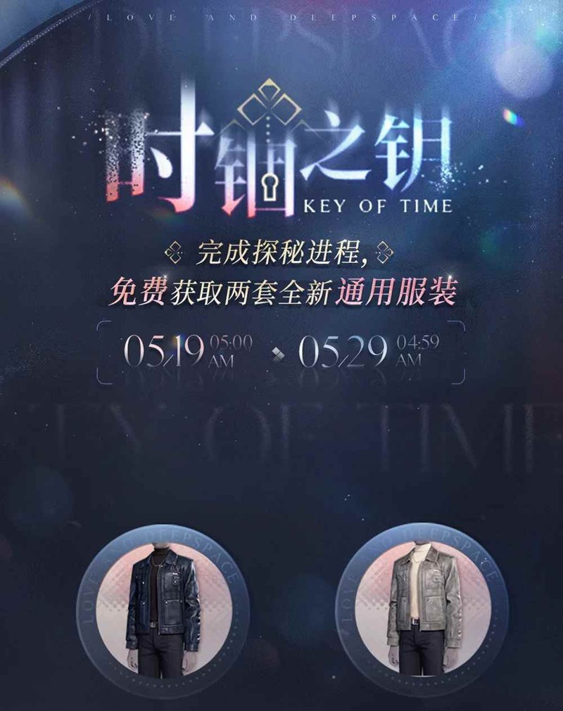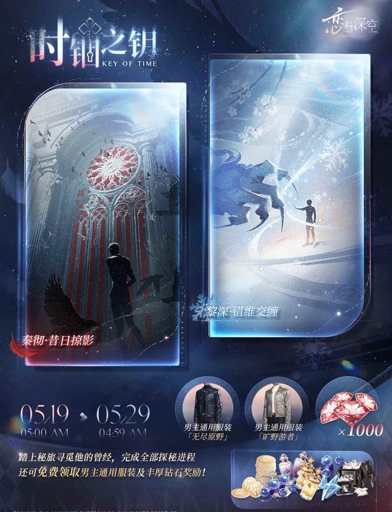 恋与深空「时锢之钥」活动即将开启!完成探秘进程,还可免费领取「钻石*1000」及「男主通用服装*2」!活动时间: 5月19日上午5:00~5月29日上午4:59