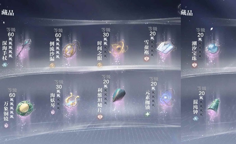 先说果实部分,如果你有条件和毅力,崩坍稳定在60%-30%成绩之后,每天定闹钟种树,保持世界树在任何时间都是3颗果实浇满的状态。或者退而求其次,每天至少保持2轮收获/多刷钱,用万象养料催熟,来保证一天3收。接下来是藏品顺序:第一步①拿全所有的紫色及以下(蓝、白)藏品尤其是主神商店部分,除非卡商店等级,否则一律只换藏品Ps:以下所有攻略步骤,均除南洲战纪藏品部分,放在最后单独说②把所有紫色藏品均升到1星20级如图所示(此步骤和①穿插进行),为目前零氪玩家所有能拿到的紫色藏品