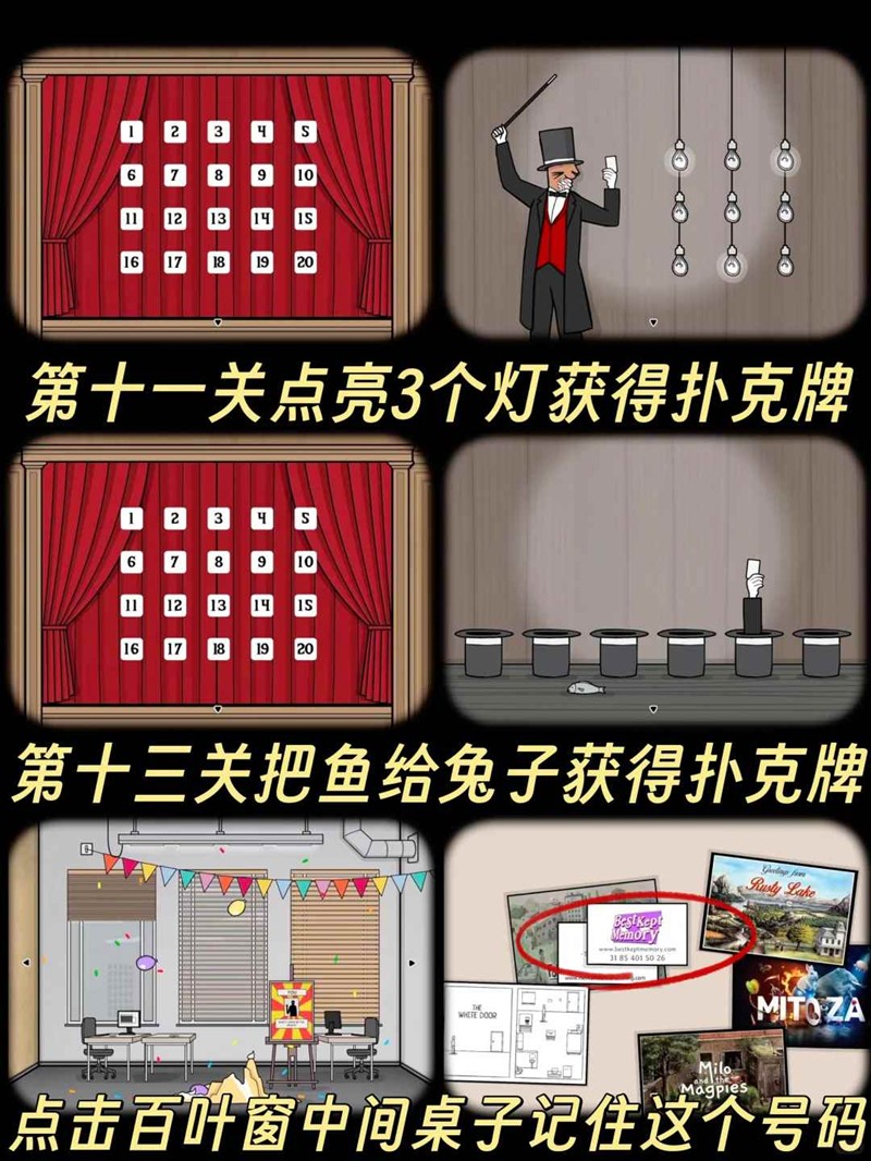 方块系列(4张)A:第3幕观察魔术师右手袖口,直接拾取。J:第13幕按把鱼给兔子所在的帽子,触发奖励。Q:第9幕精准投掷兔子入帽,确保一次成功且兔子存活。K:第11幕点亮第一行1、3号灯泡+第三行2号灯泡,解锁。
