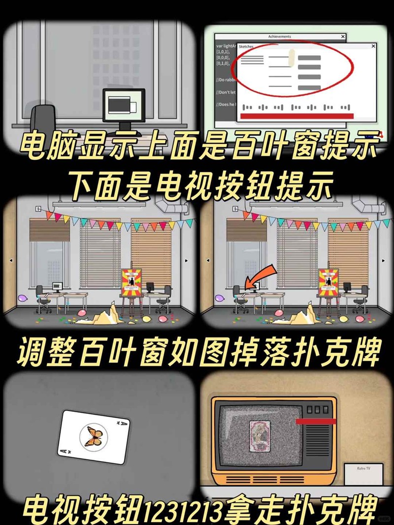 蝴蝶系列(4张)J:全地图切换场景,找到红色兔子气球并戳破。Q:第二集展柜下方左侧柜门内直接获取。K:第二集持续点击灯,待灯掉落出现卡牌。A:操作电脑调整百叶窗对应窗口,地面拾取。