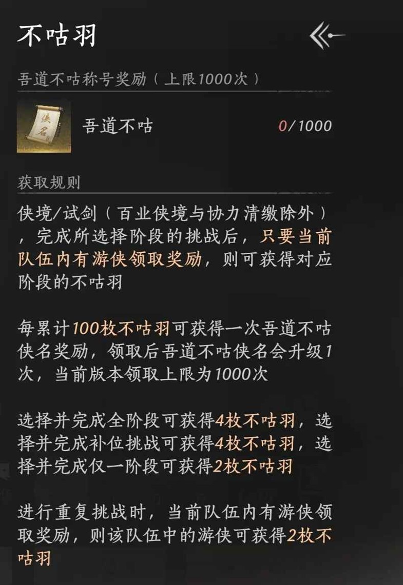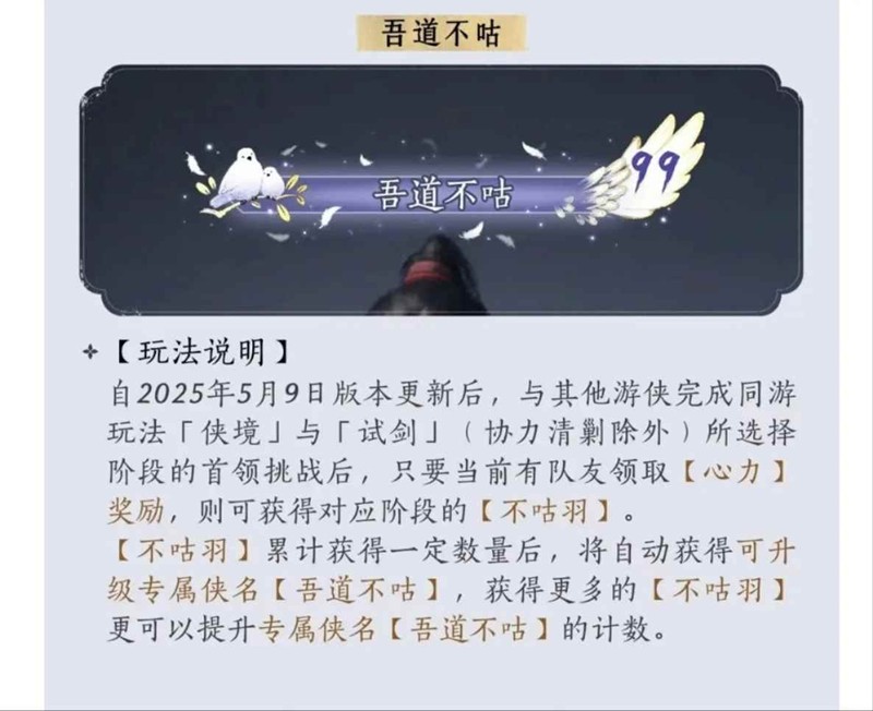 燕云十六声新出了一个非常精美的称号“吾道不咕”,打副本时有人领取奖励可获得2跟羽毛,打完全阶段和匹配补位都是4根,重复挑战只有2根。100个羽毛可领取一次称号,称号可以升级999次,10000个羽毛升到满级,升级后的不咕会有翅膀和数字显示。那么怎么快速获得这个称号呢?为你准备了一份攻略,一起来看看吧~