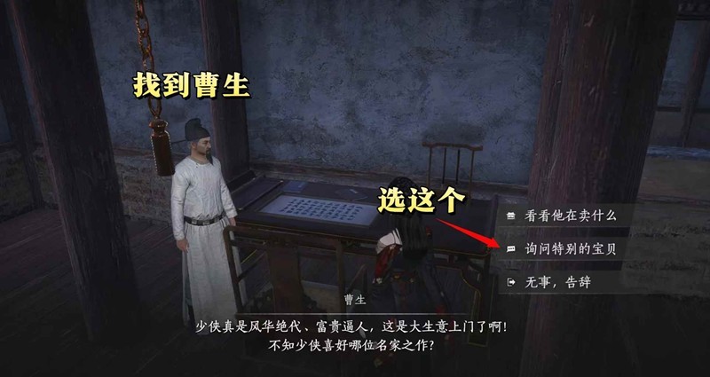 燕云十六声游戏的故事背景设定在五代十国与宋代的交替之时,玩家作为一名侠客,开启属于自己的武侠故事。游戏允许专注于“东方武侠世界中存在的各种身份和职业”。游戏中会有多种不同的玩法风格,如剑术、武技、甚至是太极等,可以混合搭配剑法、近身战等来战斗。那么游戏中金色品质增益心法四时无常应该怎么获得呢?为你准备了一份攻略,一起来看看吧~P1图:先来到“开封城”勾栏瓦肆上边的这个地方P2图:找到“书画院”,一搬旁边会有一个看字画的奇远路人,可以当做参照物P3图:把时间调为“辰”时,要不然见不到“曹生”P4图:进到书院里找到曹生跟他对话选择第二个“询问特别的宝贝”把曹生书画店里的残页都买完,打开心法直接领悟就可以了。以上就是燕云十六声增益心法“四时无常”速拿教程的全部内容了,更多游戏资讯,攻略内容敬请关注,您的支持是我们努力的动力!