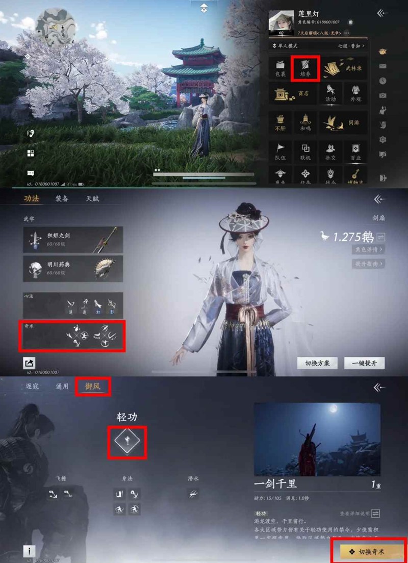 1. 切换大轻功:培养(快捷键H)-奇术-御风 右下角切换奇术2. 烟花在哪里呀烟花在哪里?烟花在那背包快捷道具里~3. 心法装备套装等官方推荐:培养-提升指南-流派指引 完全不懂的话可以参考用 略懂之后可以再结合一些攻略up修改~这里面还有一些任务奖励哦!等肝完地图我就去打打(