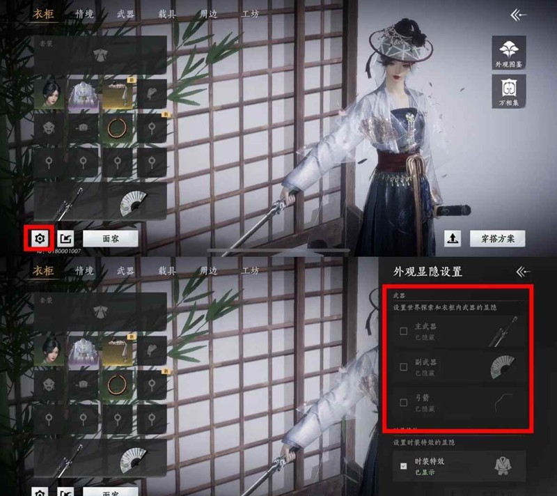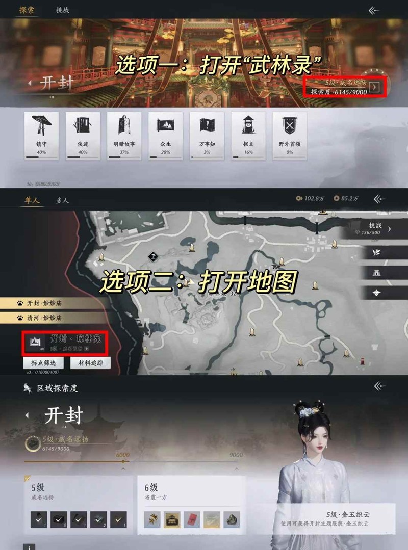 4. 探索度怎么看?打开“武林录”或者左上角小地图(快捷键M) 框起来的地方就是啦5. 想要隐藏武器和弓箭:外观左下角!移动端是设置图标 pc端就直接六个字“外观显隐设置” 点进去取消就好了6. 想在小地图上显示宝箱:角色-探索属性-探索技能 宝箱在最后一档 点开就可以查看需要提升什么志趣属性啦 点开对应的属性也可以看提升渠道(或者去问燕叽 后面会提到燕叽)这里也可以看是不是奉公守法好公民 有没有被诬陷~我忘了被诬陷时候主界面会不会显示了