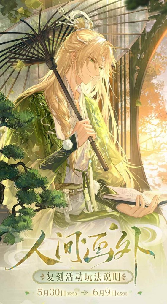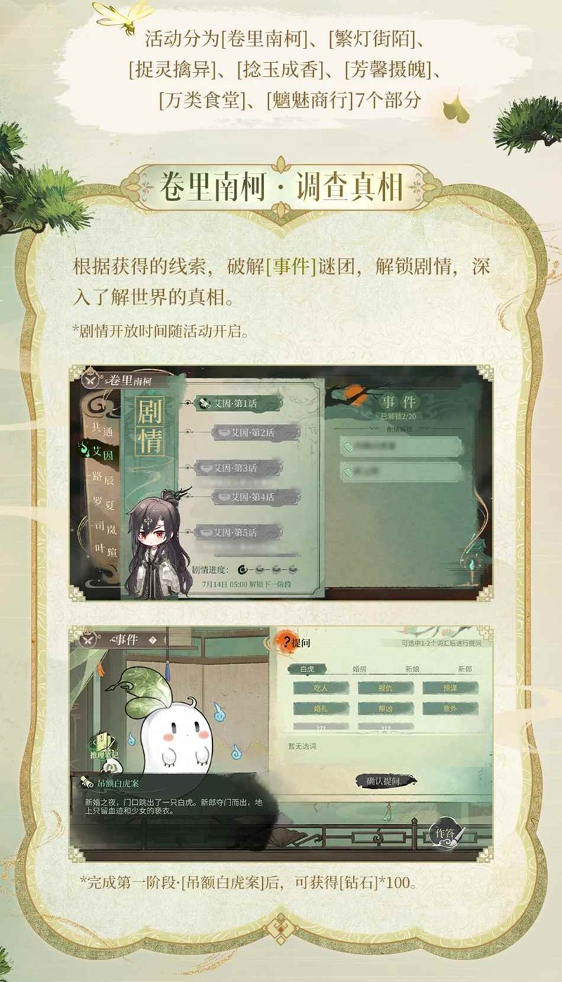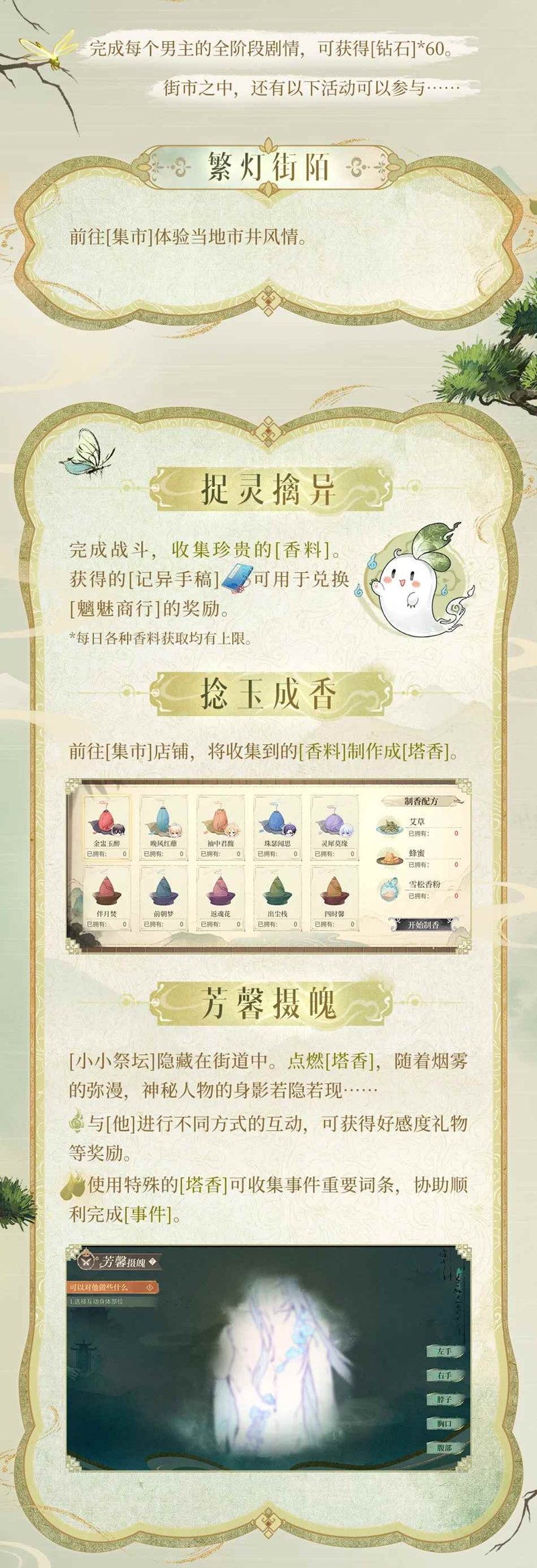 开启时间:5月30日09:30 – 6月9日05:00,通过[花架]进入「人间画外」复刻活动。活动玩法:复刻活动分为[卷里南柯]、[繁灯街陌]、[捉灵擒异]、[捻玉成香]、[芳馨摄魄]、[万类食堂]、[魑魅商行]7个部分。► 收集线索,破解事件谜团,解锁活动剧情。► [捉灵擒异]获得[香料],制作[塔香]。在[小小祭坛]中点燃[塔香],与神秘人物的身影互动获得奖励及事件词条。