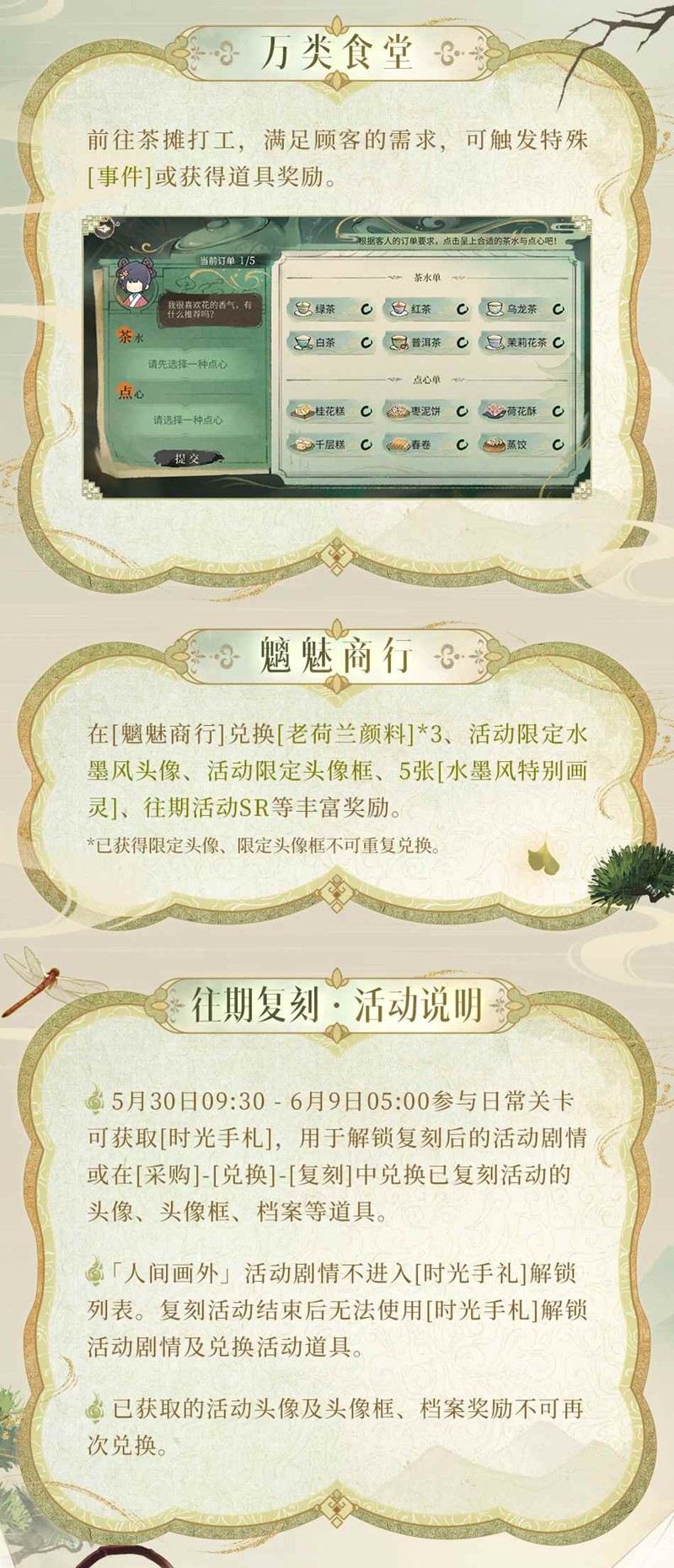 * 已获得的限定头像、头像框不可重复兑换。「人间画外」活动剧情不进入[时光手札]解锁列表。5月30日09:30 – 6月9日05:00活动期间掉落的[时光手札]可用于解锁往期活动剧情。