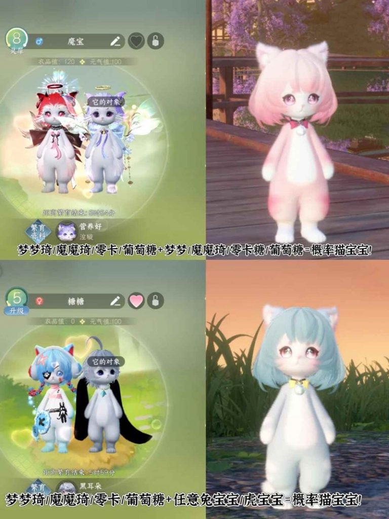 新猫宝宝提前繁育版!快人一步!目前已经上线的梦梦琦/魔魔琦/零卡/葡萄糖都是猫型福宝宝!那我们可以在更新前先普通繁育,等周五更新后再打开就有概率生出新猫宝宝啦!