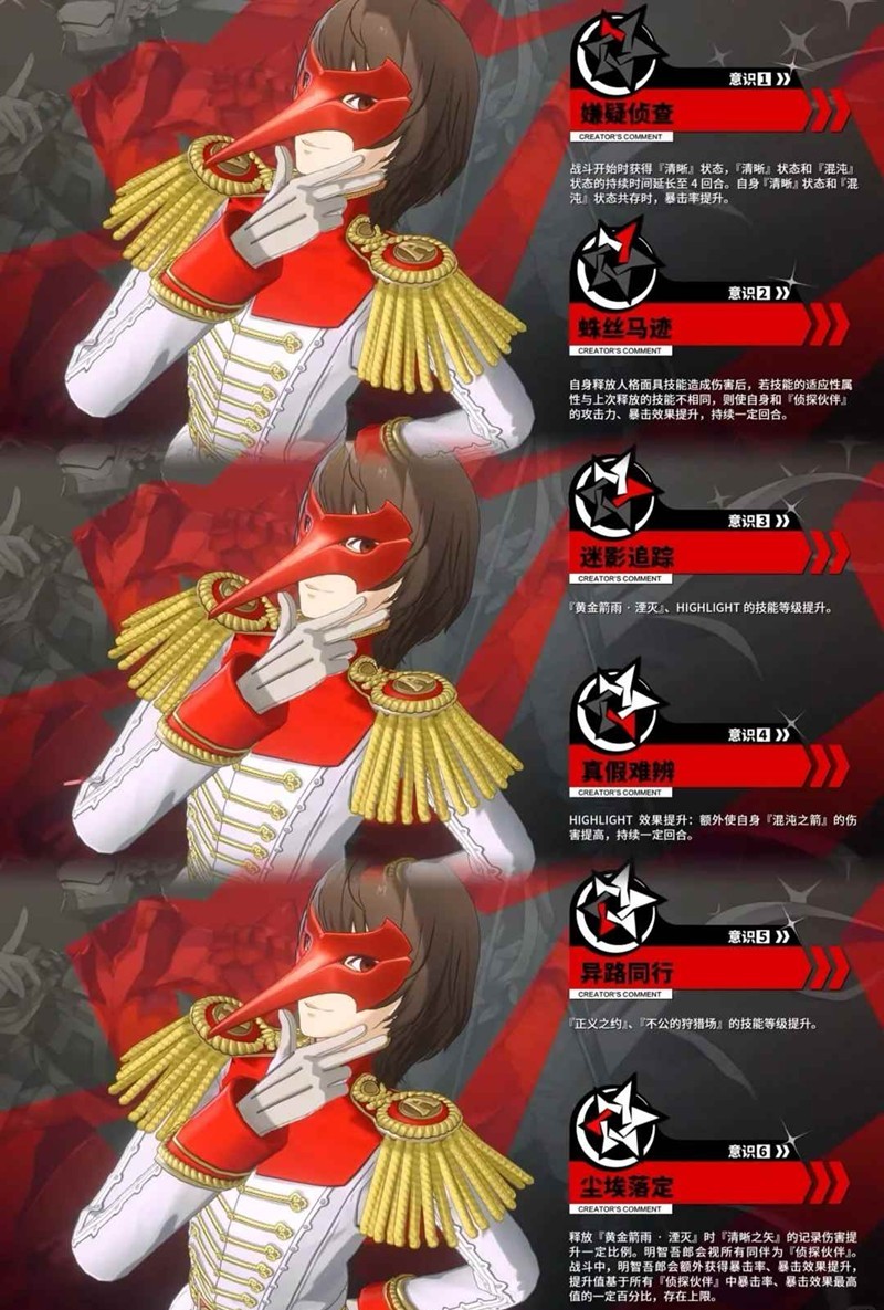 个人认为松饼的侦探伙伴机制需要频繁打伤害或者行动数多的怪盗去叠加伤害值,因此这里还是比较推荐雨宫莲技能:1234都需要点满,回合里的释放顺序目前来看大概率为123或213循环,需要清晰混沌特性同时存在总结:推荐抽取00、10、66,优先命座再专武,专武个人认为不是刚需,松饼的定位更加偏向公会本,资源不够或者对松饼不感兴趣的小伙伴可以选择跳过等下版本的结城理,当然抽一个本体开图鉴拿头像去公频划水也是很不错的,毕竟谁能拒绝一个松饼头像呢