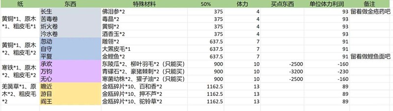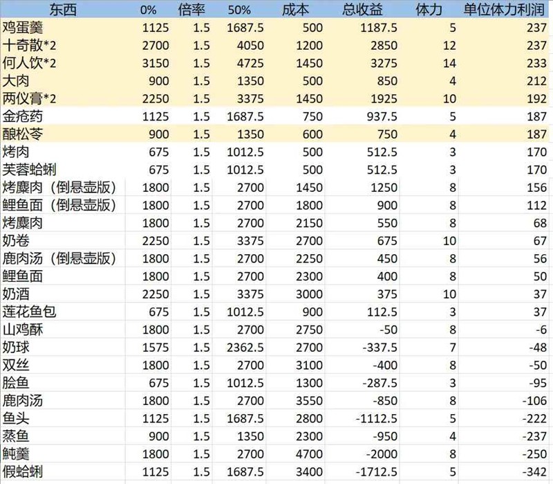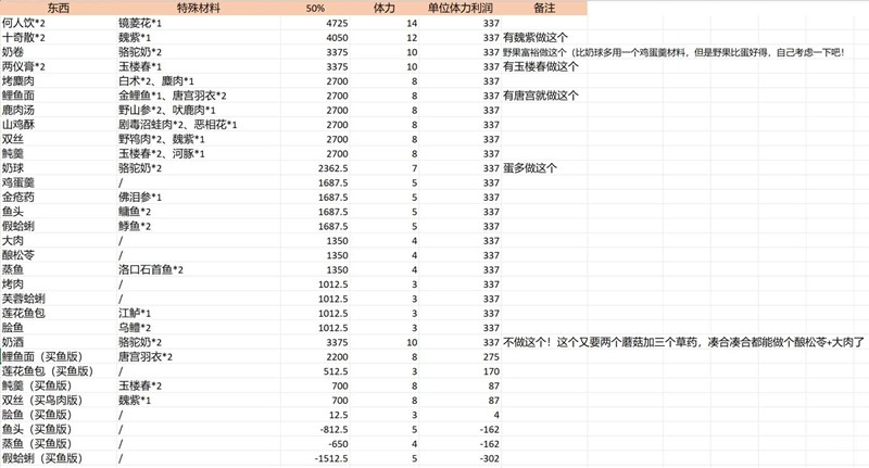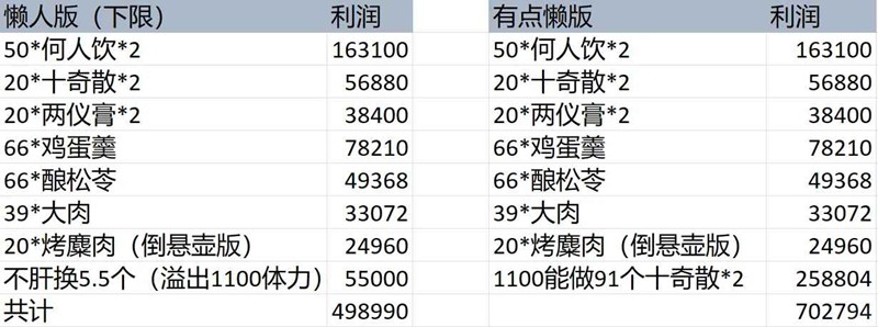 燕云十六声有销金窟玩法,玩家可以通过制造出一些菜品和药品到销金窟进行售卖赚取宝钱。那么销金窟售卖的各种物品利润收益是如何呢?如何快速赚取宝钱呢?为你准备了一份攻略,一起来看看吧~纯买。纯采+买采交叉(买了鱼和鸟肉等特别麻烦的材料)。增益帖制作,纯采集版(除了目前还不能通过收集获得的材料用钱买了)能把之前叠音剩下的材料给用了,但收益好小!。收益。必买:每周清河开封买光所有草药、蘑菇、碎肉、野果、蛋,清河买所有麋肉,河西买所有镜菱花,鬼市倒悬壶买所有草药、白术(买麋肉*2的数量,不打猎就买40个白术,觉得麻烦的直接all in囤着算了,反正比生活超市卖的便宜多了)、野山参(配吠鹿肉,买这个肉性价比不高,包里有鹿肉才买)、唐宫个人觉得没必要买,大世界摸的够用了,做菜还要和金鲤鱼配,性价比好低。做:第一步:制作所有两仪膏、十奇散、何人饮(后面这俩草药使用性价比最高,耗体力多,纯买材料周一耗1140体力)。相信大家肯定会在跑图的时候顺手摘下草吧!所以其他特殊材料可以看下p2纯采集版本制作一下,体力耗的越多越好,毕竟人懒。这一步可能会用到每周扫荡生活超市的普通材料,因为全部量化做表格好麻烦我只做了珍稀鱼肉和鸟肉购买的版本,没有做只买草药等普通材料的买采交叉版的饭药利润表,但是总归是比纯买利润要高的。第二步:用剩下的材料做鸡蛋羹、酿松苓,能做多少就做多少(相互不抢材料,利润高。周一各66个,-594体力)。第三步:看剩下草药,买厚脂肉做大肉(周一不采集的话还能做39个,-156体力,金创药利润干不过大肉)。第四步:烤麋肉(周一能做20个,-160体力),蛋还剩下几十个,有骆驼奶的可以去做奶球。第五步:周一还剩下450体力,等下一周刷新的时候溢出1100体力,可以直接换。觉得好亏的可以看看包里有什么珍稀材料(同利润下耗体力越多越省事,所以还是优先做药!!微懒财迷推荐),去大世界配一下普通材料做成饭,懒得摸珍稀材料的,继续去大世界无脑摸鸡蛋羹的材料和草药(做大肉,肉没买到上限)就好了。普通材料很缺,珍稀材料能减少菜里普通材料的使用量,所以有珍稀材料的就先把这些给配成菜,节省一些普通材料。当然也有劳模屯草药每天摘魏紫玉楼春镜菱花做药….不说他们了!!最后:其实我自己也没算的太明白!累了,算得我迷迷糊糊的,表格和文章有任何问题欢迎指出呜呜!非常感谢大家的指正!!以上就是燕云十六声销金窟收益利润表怎样赚宝钱攻略的全部内容了,更多游戏资讯,攻略内容敬请关注,您的支持是我们努力的动力!