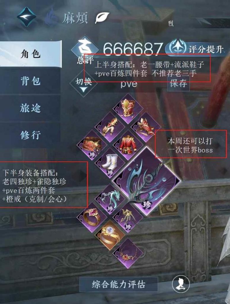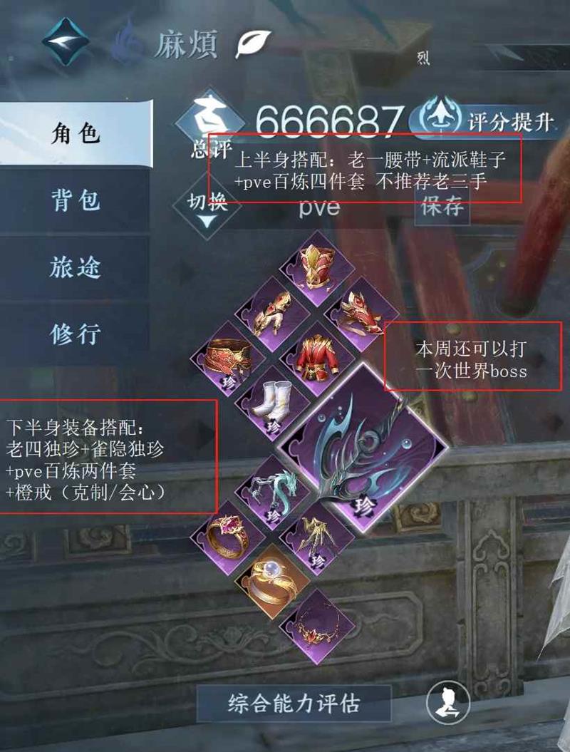 神相攻克pve搭配攻略:上半身装备搭配:霍乘龙·带+梁山伯鞋子+Pve百炼四件套上半身搭配2:缺会心版:老一腰带+老三手+pve百炼四件套下半身搭配:老四独珍+雀隐独珍tpve百炼两件套+橙戒(会心)武器带新地图世界boss的船锚 每周可以打boss升级一次属性