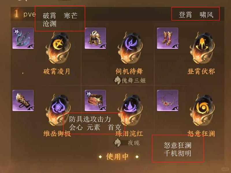打造:武器:破霄 寒芒 苍渊 临战鞋子:登霄 覆海 千载 啸风项链:怒意狂澜 千机彻明防具:防具可以带各种带有pve词条的 攻击力·元素攻·会心·首领克制