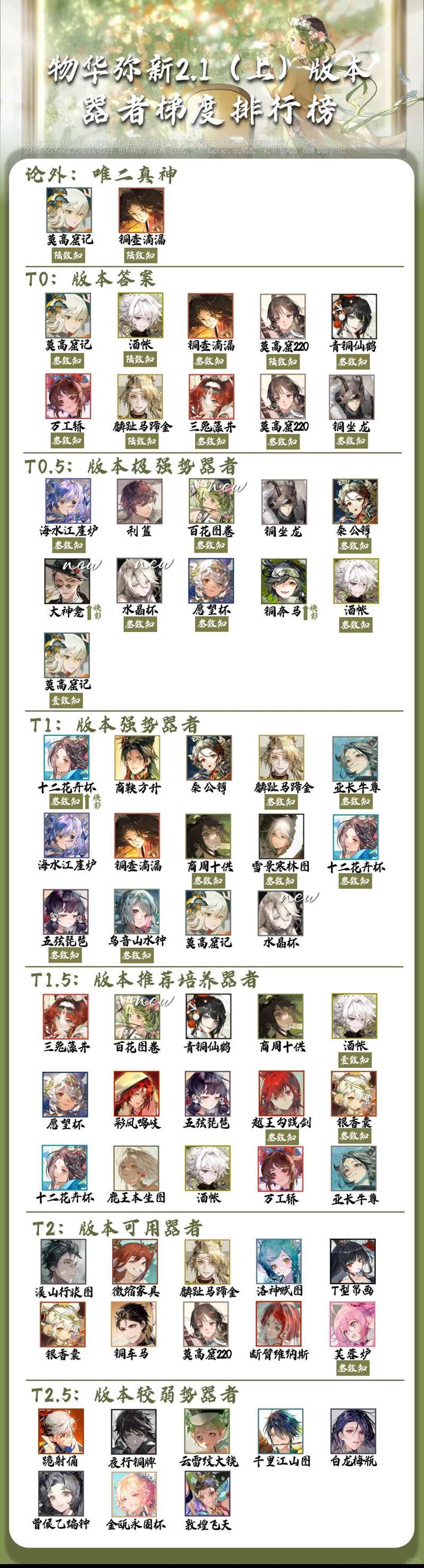 一件物,一些人,一个时代,过去的图卷正在徐徐展开,车马如潮而行,乐曲纵扬回旋,诗书画卷纷纷洒洒,这些是来自古代的历史。伴随人类之手的诞生,有时遍身尘埃,也曾历经千年,共赴去历久弥新的未来。物华弥新游戏中玩家将扮演收藏家,与器者们一起,对抗侵入现世的传说怪物“曲解”。那么游戏中应该养什么器者呢?为你准备了一份攻略,一起来看看吧~新器者简评及抽取建议:百花图卷:泛用性极强的辅助,三致知不仅在提供啸剑蓄势的同时,还能提供两种类型的buff,是各个体系队最强的辅助兼奶妈,唯一缺点在于2+2+2站位的关卡不好发挥。推荐所有收藏家都至少抽取一只,没有辅助的收藏家(如三兔、海水、滴漏)建议抽取三致知。水晶杯:真正的弈局大c来了!由于水晶杯被动的结算机制,导致该角色吃拐能力极强,五拐一的输出已经远远超过牛轿的连击队!但由于主要输出在于对单,日常/速通环境表现较为一般,不过仍然推荐所有收藏家抽取一只,这角色是完全有能力贷款未来的。大神龛:轮均30万输出的对单大c,循环自洽无任何空窗期,在所有环境下表现都非常好,但必须配合一名能超速大神龛的远击器者,三兔藻井为最优选择。在速通环境下,三致知三兔藻井配合大神龛能打出首轮三动的超高爆发。并且大神龛的焕彰超出1%暴击能转换为1.5%防穿,越高难、敌方防御力越高表现越好。推荐所有收藏家都进行焕彰(极其推荐拥有三兔藻井的收藏家)!该版本梯度上升的器者:焕彰铜奔马:焕彰提供的特有的易伤乘区让小马成为超强辅助,并且新武器完美解决了小马的回能问题,让小马在各个环境下的辅助能力都极大的提升了,尤其在弈局环境。因此梯度从t1.5升至t0.5末利簋:由于莫高窟记的神力,使利簋已经成为速通队的刚需角色。并且新武器的出现使酒帐能够超速利簋,让酒帐在不用吃到对面伤害的时候就能够解锁六致的再动,使酒帐手感变得非常好。(原本上个梯度榜已经在t0.5了但是我忘记改了,不好意思!)溪山行旅图:我们溪山也是吃到了新武器的红利了!溪山的辅助能力本身不弱,能提供60%+的减防,但缺点就在于回能问题,这次新装备也能完美解决,对宿卫的技能循环提升非常大。以上就是物华弥新器者梯度排行榜2.1上篇的全部内容了,更多游戏资讯,攻略内容敬请关注,您的支持是我们努力的动力!
