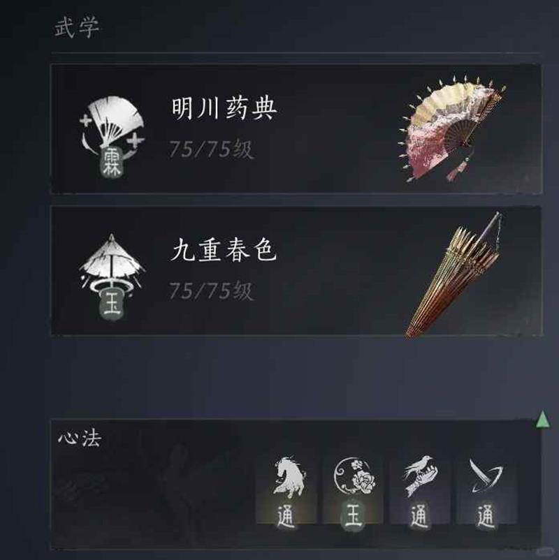 一句话总结:培养易水歌+花上月令+极乐泣血,先带威猛歌(1重),建议征人归四重后再带,就是喜欢威猛歌的可以心法转化输出手法:先说基本没有争议的伞输出循环:开炮武学技Q(吃花上月令弹道伤害加成),长按轻击飞天蓄力攻击,落地开炮武学技Q,特殊技~扔伞无人机-切武器带青衫执笔的循环:武学技Q风墙(弹道强化),平A/奇术,适合有操作的选手带明川药典的循环:奇术/平A/加血Q奇术推荐:狗嘴夺食(单体),骑龙回马(突进+单体),百鬼打穴手(五人本用得上),韦陀正法(清怪aoe),无相金身(群体减伤)