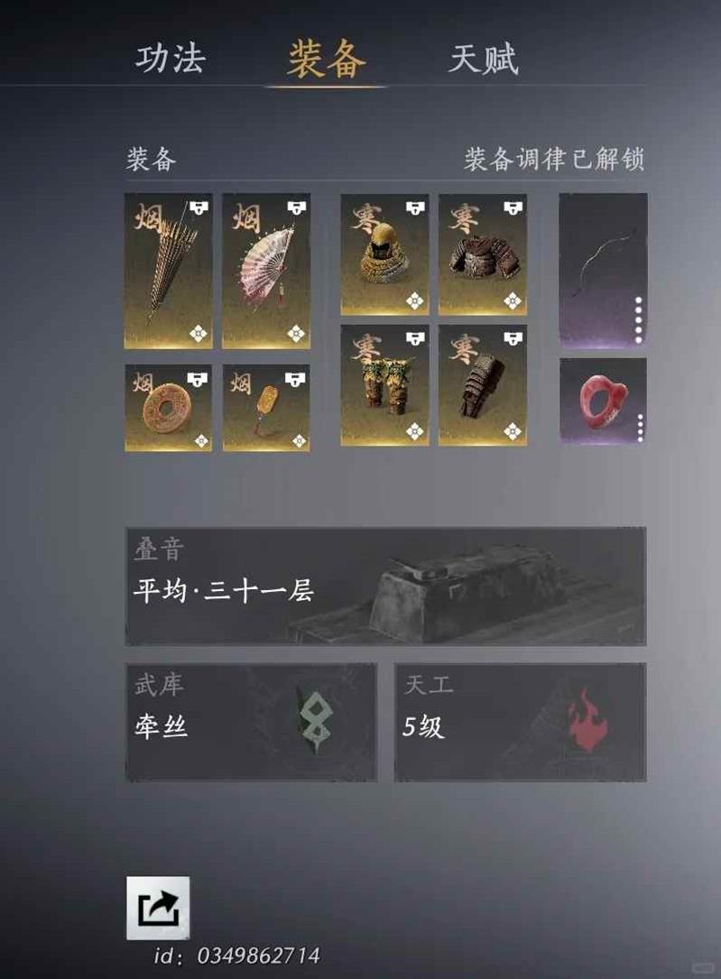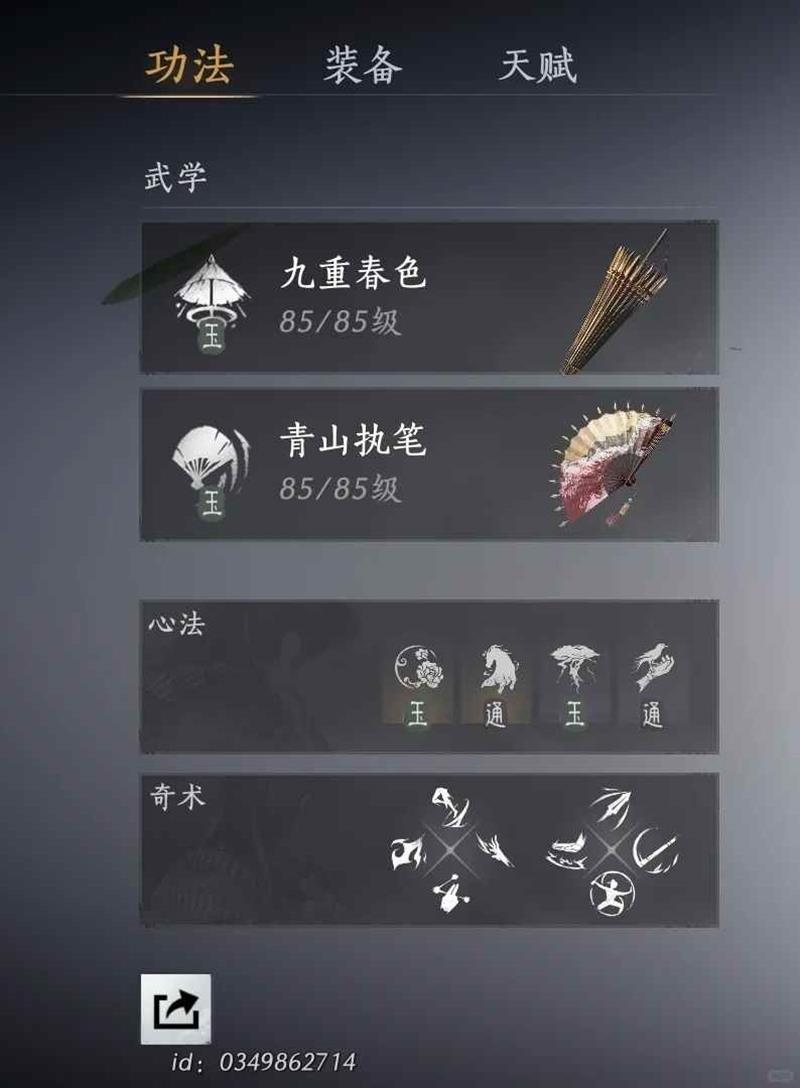 先说词条,建议先把伞武学天赋堆满,写这篇的时候是75级,这里是150敏,750最小外功攻击,167最小千丝攻击(图2)然后是套装兑换,防具无所谓有啥穿啥差不了多少,主要说武器套装烟雨:官推的套装,个人不推荐,输出手法要穿插重击才能出发轻击伤害加成buff,实战中容易乱循环,且烟雨重重buff没有内置CD,掌握不好重击时间容易“误触发”重击加成buff时雨:我现在在用的,推荐对词条有追求的玩家。词条推荐:天赋3词条(敏,小外功攻击,最小千丝攻击)+精准率100+会心率50左右(最大外功攻击+最大千丝攻击也推荐不算歪),空中轻击增伤等能加到伞轻击蓄力技的特殊词条。