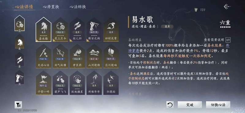 4.心法方面的话,破竹风,牵丝玉,鸣金影我个人推荐 用易水歌,所恨年年,极乐泣血,剩下带本流派的金心法,前期这么带伤害最高,后期按个流派攻略走5.蹊跷收集也可以加属性,其次不要忘了装备叠音6.实在不懂就找个老师傅吧,或者加个有活人的百业,等级不要升太快,慢慢玩就好了,不用着急追赶大部队,光心法升到6重就要3-4个月,前期主要还是剧情探索和单人BOOS为主大概就这些了7.实在找不到人带,可以问燕叽百科,就在聊天最下边和右边栏第一项