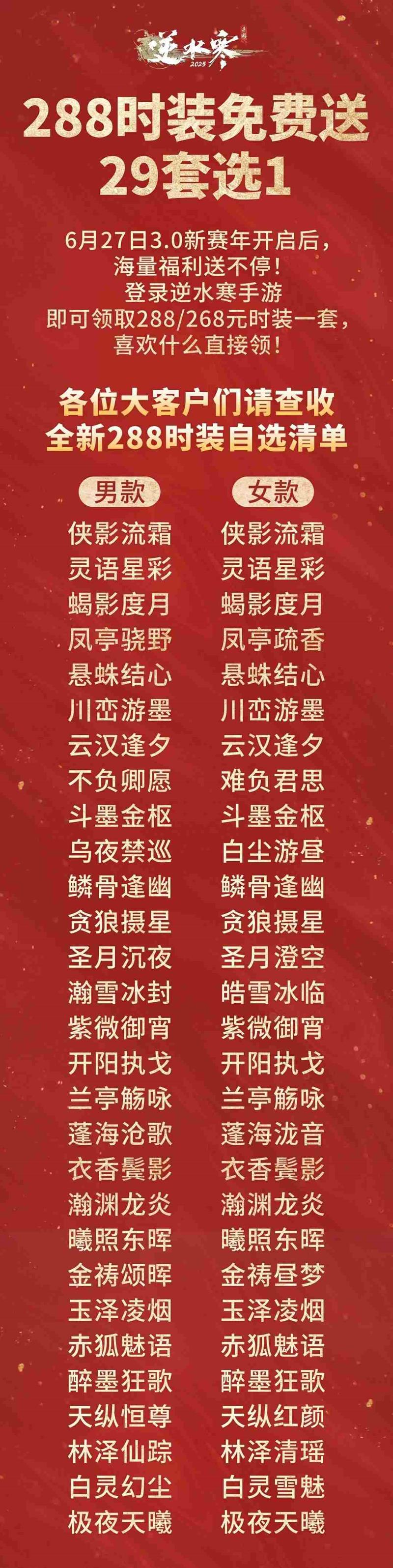 逆水寒手游二周年288自选皮肤前瞻汇总一览