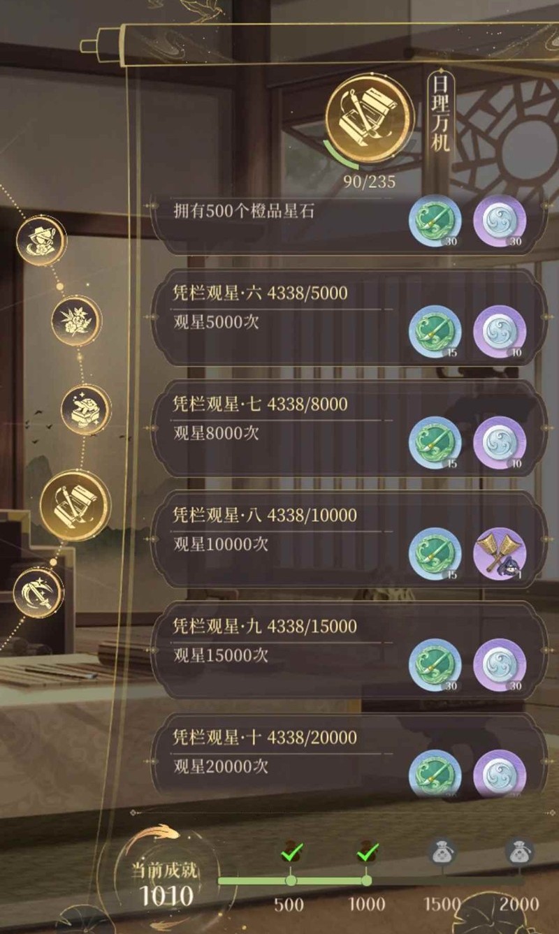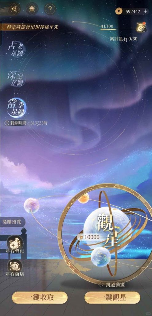 好的,今天让我们来讲讲星石。观星分为古老星图、深空星图、当季星图首先是古老星图,等级升到20级就可以开启了,星石种类最少,不建议把钱砸进去然后是深空星图,这个30级会开启,星石种类比古老星图多。前两个暴率是一样的,但是深空品种会比古老的多,还是建议把钱砸这