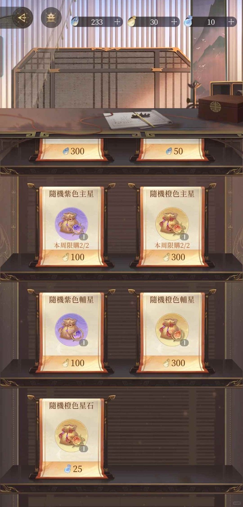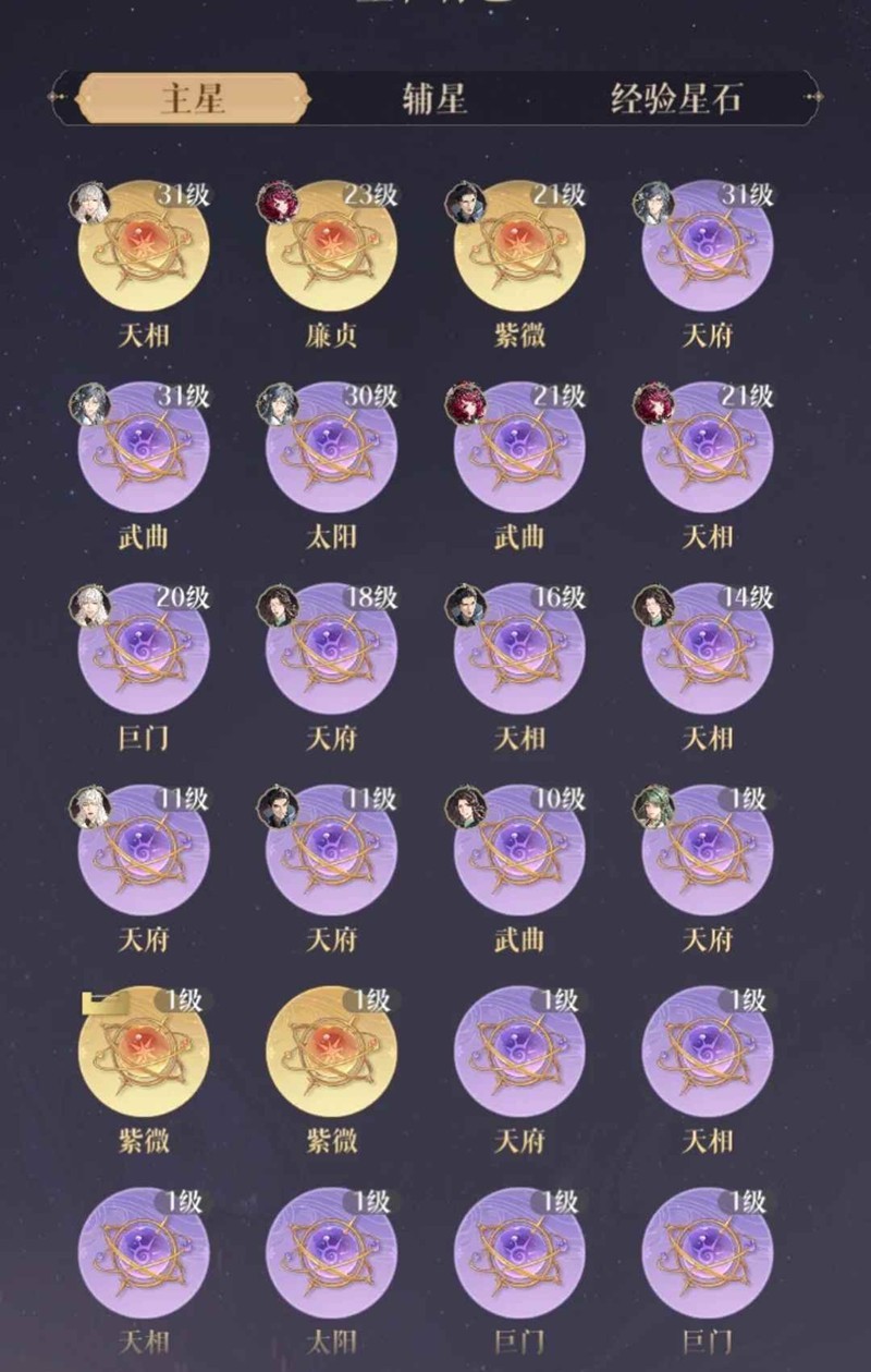然后我们来讲讲星石,它的加成是很可观的星石的强度从大到小:金>紫>蓝>绿>白每种都有主星和辅星,以p2为例,三个格,每个格可以放一个主星和一个辅星,星石之间搭配得当会有加成效果除此之外,招星时还有几率获得经验星石,可以用来给星石升级。