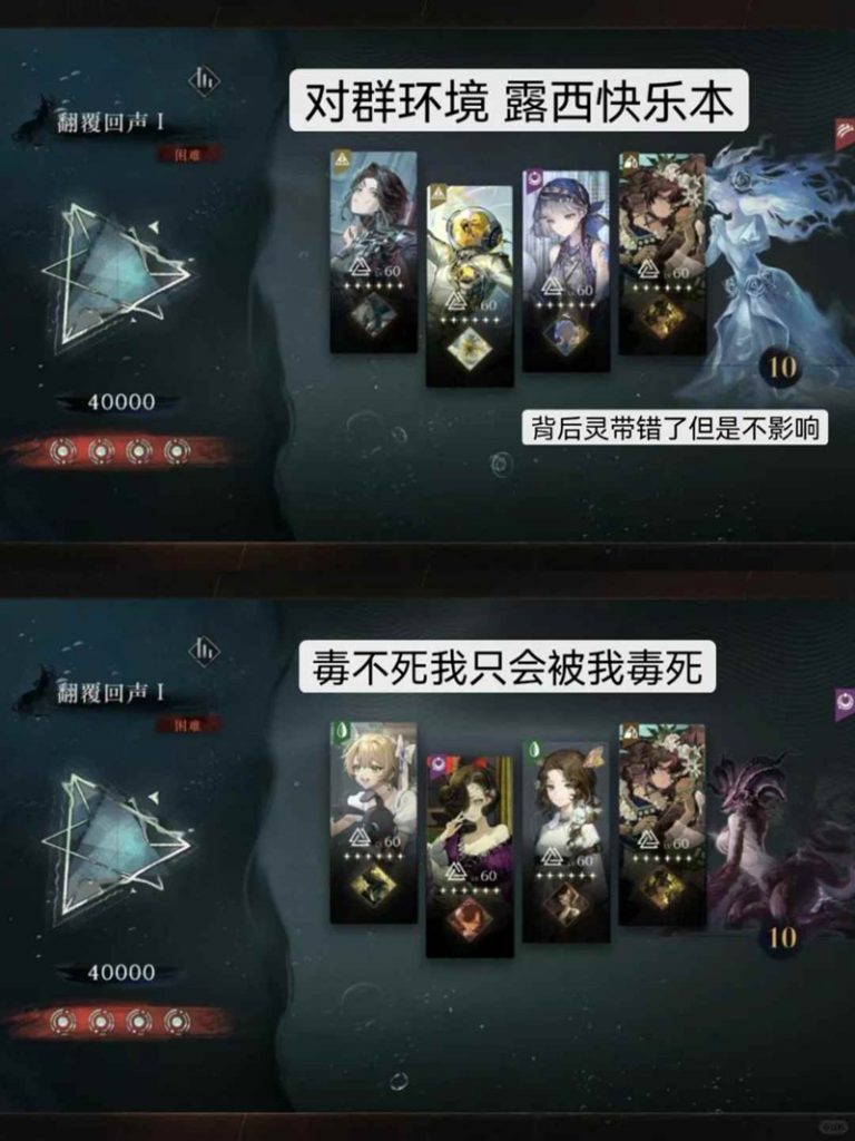第一关:灵系背后灵对群,8个小怪,本关完全是露西定制本,怪物攻击会上毒 且每回合随机净化debuff1.电能露西+组长+任意增伤辅助(水星/洛佩拉等)+任意生存(蘑菇等)2.毒队(能用但是不建议)针对很厉害,优先保生存可以磨过去