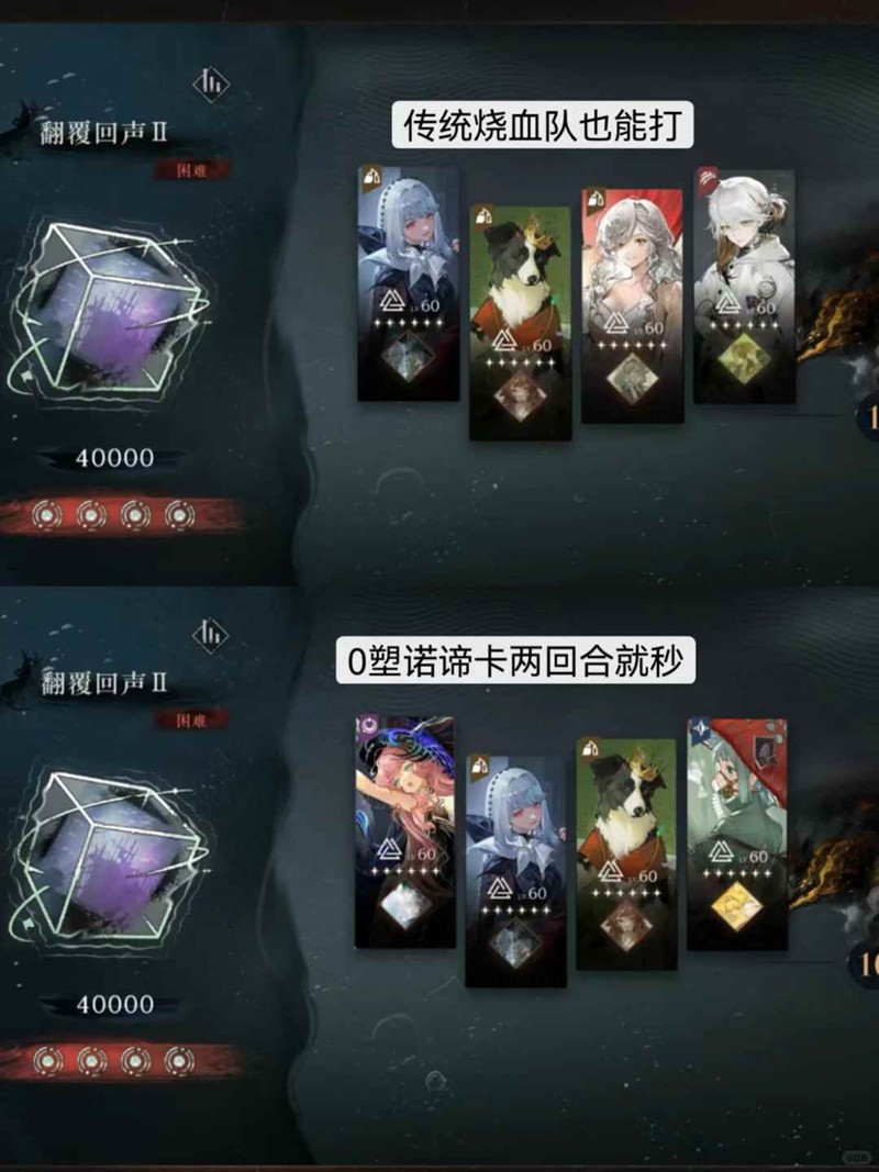 第二关:岩系背后灵1.诺谛卡薪血队诺谛卡+塞梅+狗/温妮/兔毛/蘑菇任选二无需任何手法,诺谛卡开出大招就结束了回合一:塞梅buff+诺counter+诺attack+任意回合二:塞梅大招+诺attack+任意+诺大招