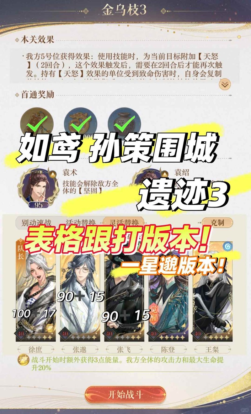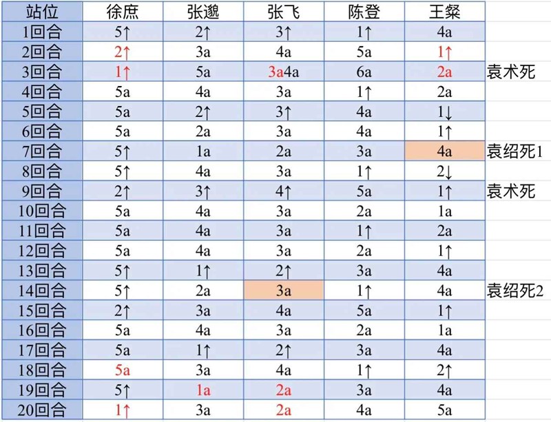 4.站位不要变动。粲↑对方偷技能,2回合打死对方,粲↓获得对方技能。5. 徐庶大招不要打残血的袁绍,尽量其他人先打出来袁绍下一条命徐庶再开大。因为余剩血量每个人情况不一,所以输出怎么最大化怎么打,输出打法可跟表,也可根据自身实际情况微调!6.袁术一定要在他放出技能前杀死掉!